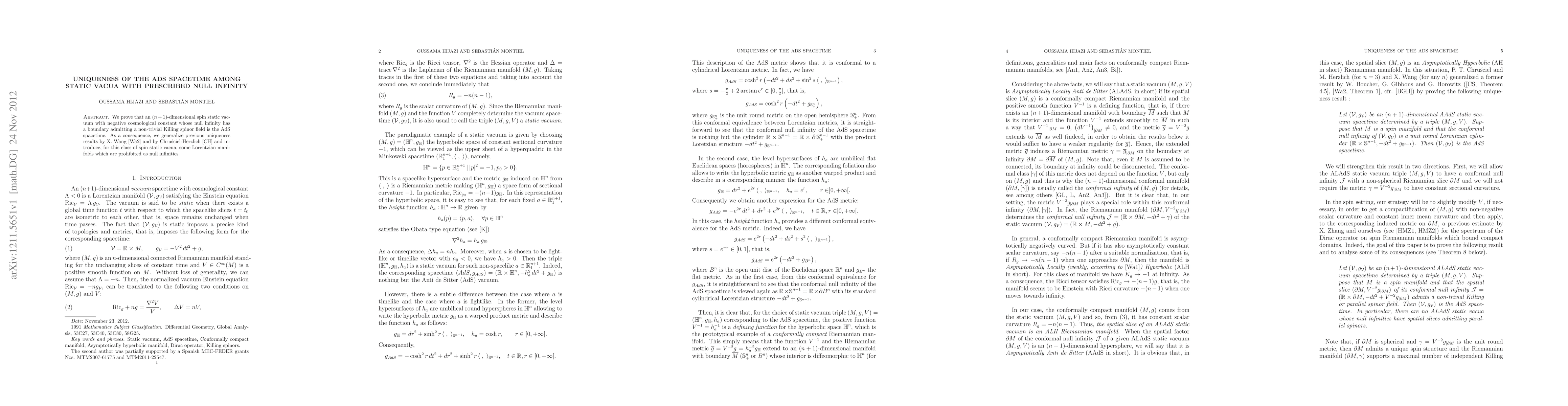 We prove that an $(n+1)$-dimensional spin static vacuum with negative cosmological constant whose null infinity has a boundary admitting a non-trivial Killing spinor field is the AdS spacetime. As a consequence, we generalize previous uniqueness results by X. Wang \cite{Wa2} and by Chru{\'s}ciel-Herzlich \cite{CH} and introduce, for this class of spin static vacua, some Lorentzian manifolds which are prohibited as null infinities.