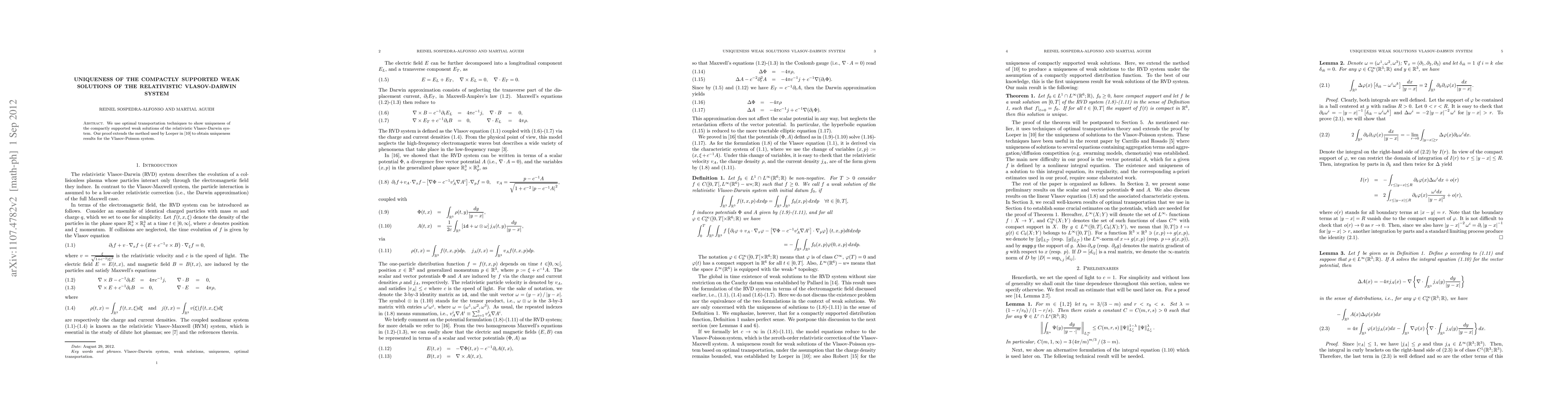 We use optimal transportation techniques to show uniqueness of the compactly supported weak solutions of the relativistic Vlasov-Darwin system. Our proof extends the method used by Loeper in J. Math. Pures Appl. 86, 68-79 (2006) to obtain uniqueness results for the Vlasov-Poisson system.