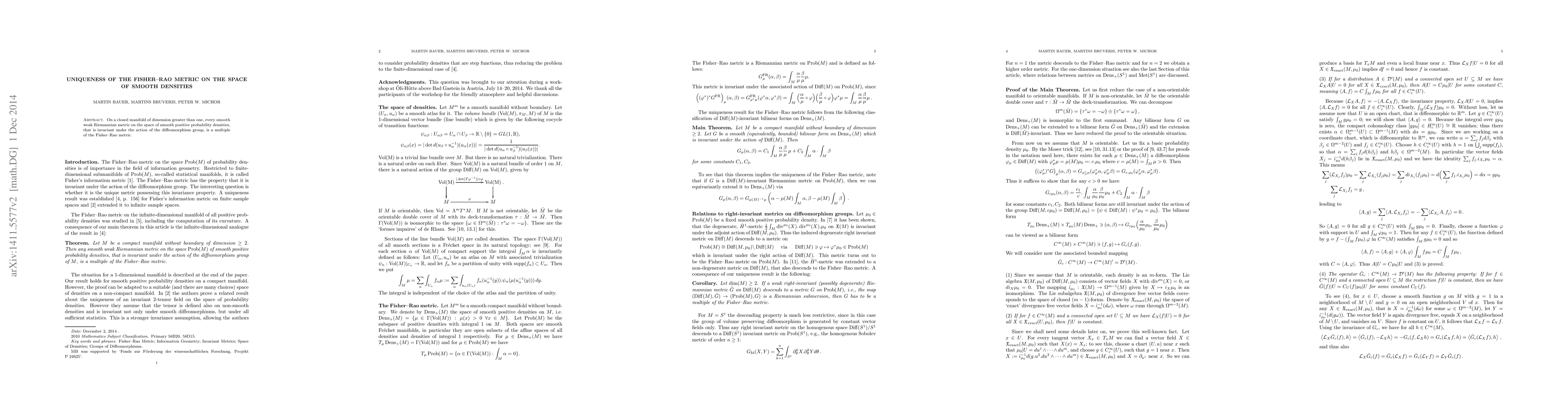 Summary: The paper demonstrates that on a closed manifold of dimension greater than one, any smooth Riemannian metric on the space of smooth positive probability densities invariant under diffeomorphisms is uniquely determined as a multiple of the Fisher-Rao metric. This establishes the uniqueness of the Fisher-Rao metric in this context.