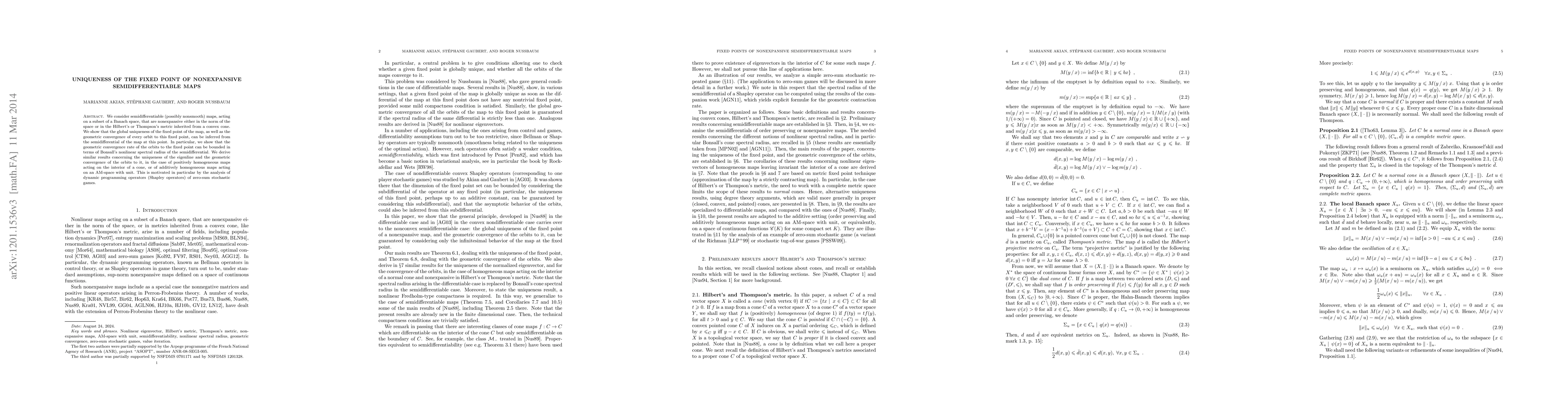 This paper investigates the uniqueness and convergence properties of fixed points for nonexpansive semidifferentiable maps in Banach spaces, showing that these properties can be deduced from the map's semidifferential. It also establishes convergence rates bounded by the nonlinear spectral radius and applies these results to positively homogeneous maps and dynamic programming operators in zero-sum stochastic games.