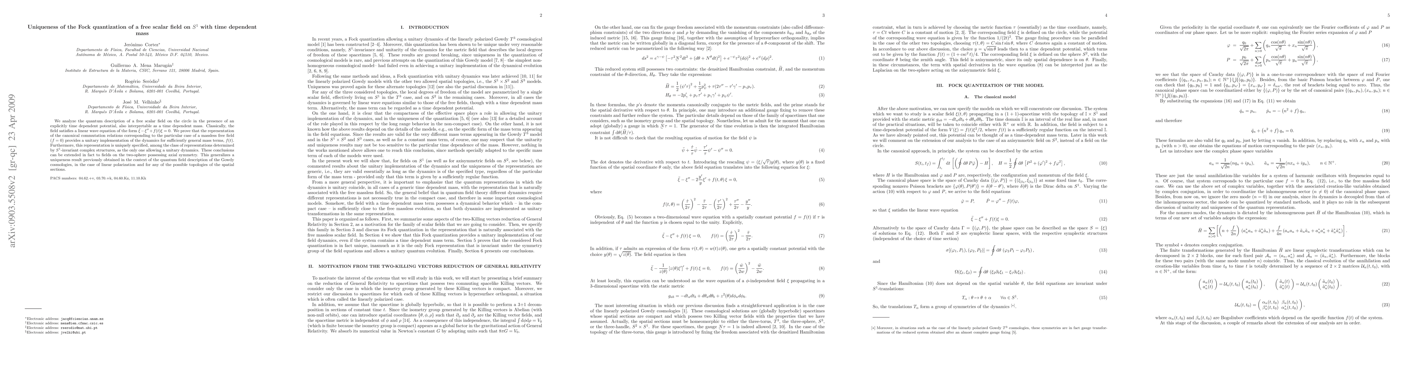This paper proves that the Fock quantization of a free scalar field on $S^1$ with a time-dependent mass uniquely implements the dynamics, and this representation is the only one allowing unitary dynamics among $S^1$-invariant complex structures. The result extends to fields on the two-sphere with axial symmetry.