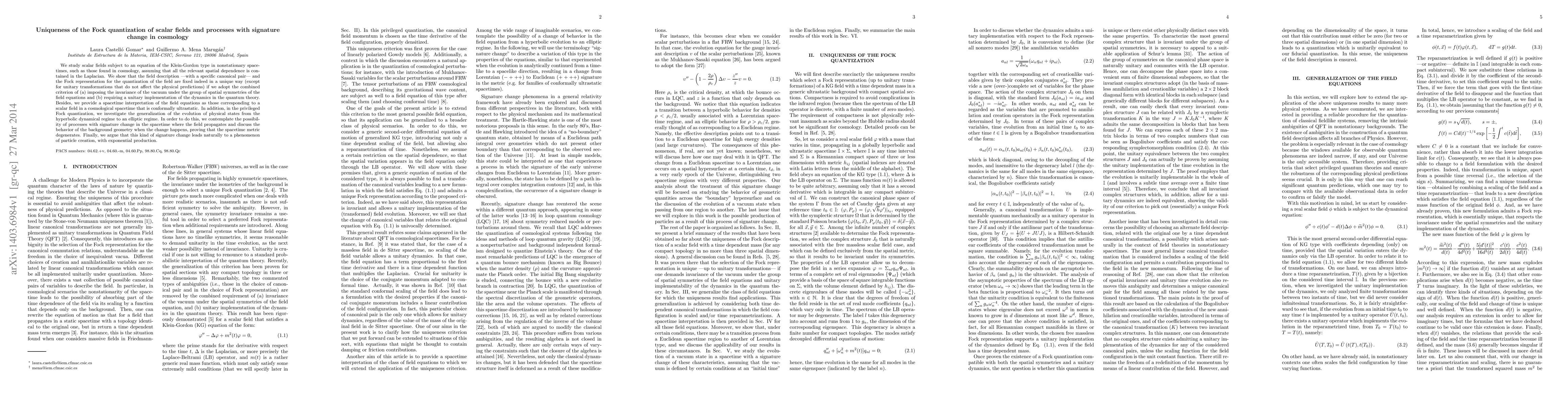 We study scalar fields subject to an equation of the Klein-Gordon type in nonstationary spacetimes, such as those found in cosmology, assuming that all the relevant spatial dependence is contained in the Laplacian. We show that the field description ---with a specific canonical pair--- and the Fock representation for the quantization of the field are fixed indeed in a unique way (except for unitary transformations that do not affect the physical predictions) if we adopt the combined criterion of (a) imposing the invariance of the vacuum under the group of spatial symmetries of the field equations and (b) requiring a unitary implementation of the dynamics in the quantum theory. Besides, we provide a spacetime interpretation of the field equations as those corresponding to a scalar field in a cosmological spacetime that is conformally ultrastatic. In addition, in the privileged Fock quantization, we investigate the generalization of the evolution of physical states from the hyperbolic dynamical regime to an elliptic regime. In order to do this, we contemplate the possibility of processes with signature change in the spacetime where the field propagates and discuss the behavior of the background geometry when the change happens, proving that the spacetime metric degenerates. Finally, we argue that this kind of signature change leads naturally to a phenomenon of particle creation, with exponential production.