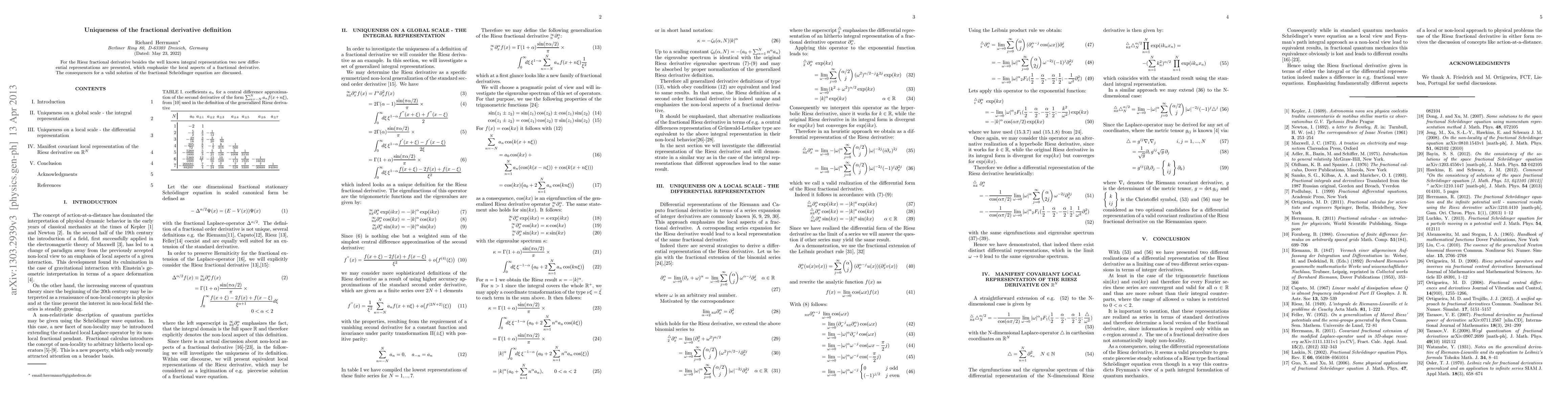 The paper investigates the uniqueness of the Riesz fractional derivative definition by presenting new differential representations, emphasizing local aspects, and discussing consequences for the fractional Schrödinger equation.
