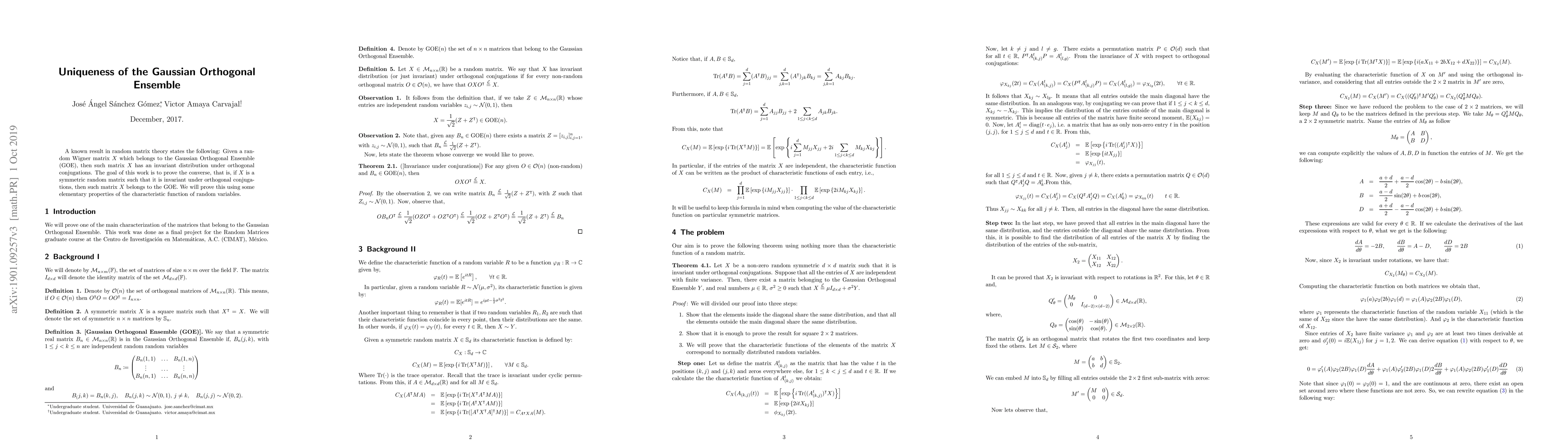 This paper proves that a symmetric random matrix invariant under orthogonal conjugations belongs to the Gaussian Orthogonal Ensemble (GOE), establishing the uniqueness of the GOE. The proof leverages elementary properties of the characteristic function of random variables.