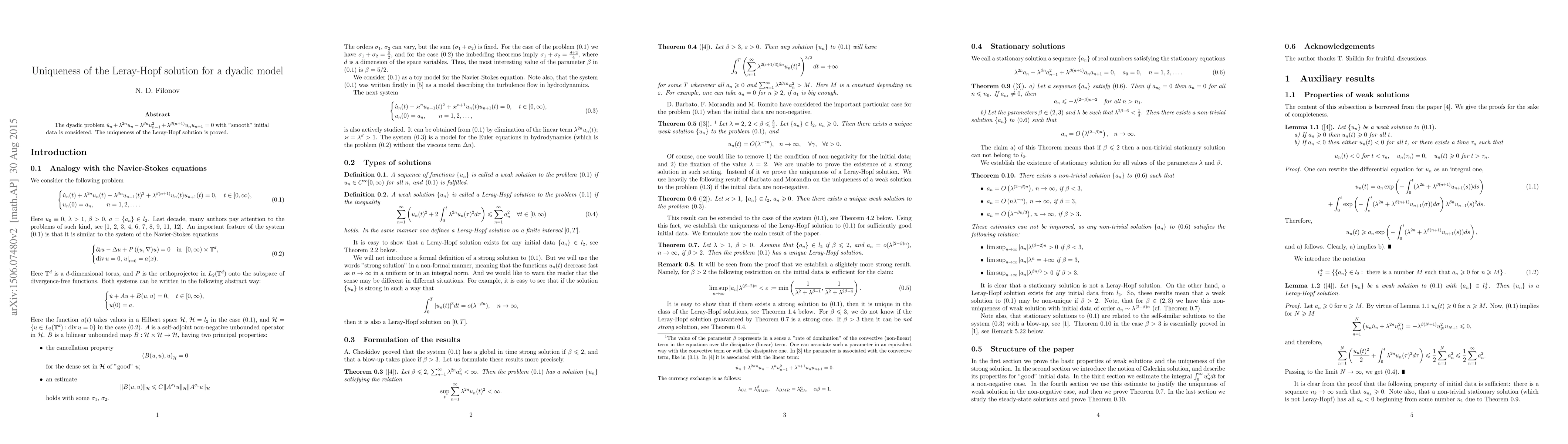 The dyadic problem $\dot u_n + \lambda^{2n} u_n - \lambda^{\beta n} u_{n-1}^2 + \lambda^{\beta(n+1)} u_n u_{n+1} = 0$ with "smooth" initial data is considered. The uniqueness of the Leray-Hopf solution is proved.