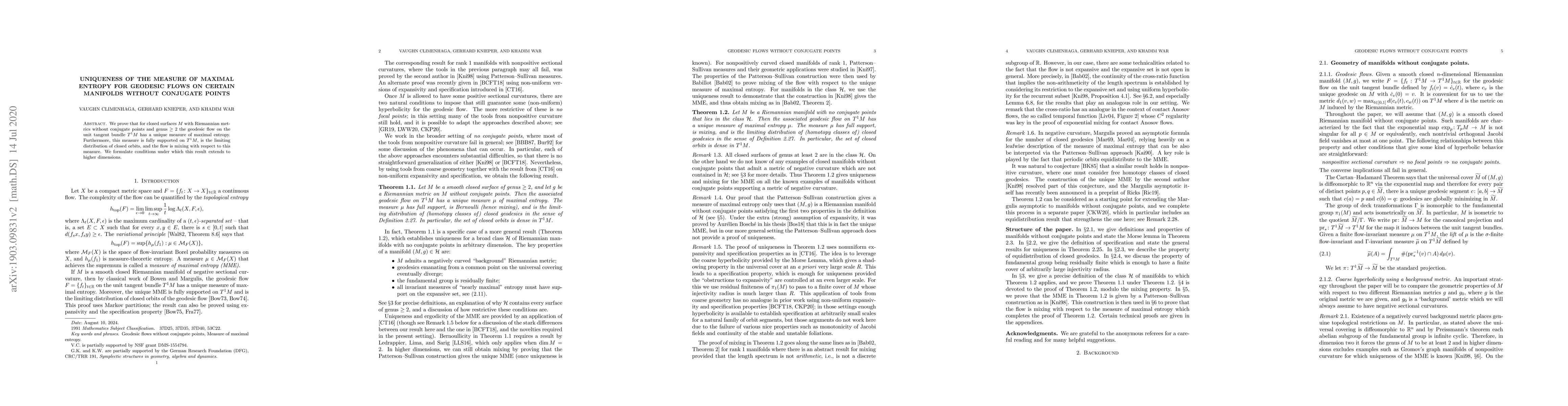 This paper proves the uniqueness of the maximal entropy measure for geodesic flows on closed surfaces of genus ≥ 2 without conjugate points, showing it is fully supported and that the flow is mixing with respect to it. The authors also discuss conditions for extending this result to higher dimensions.