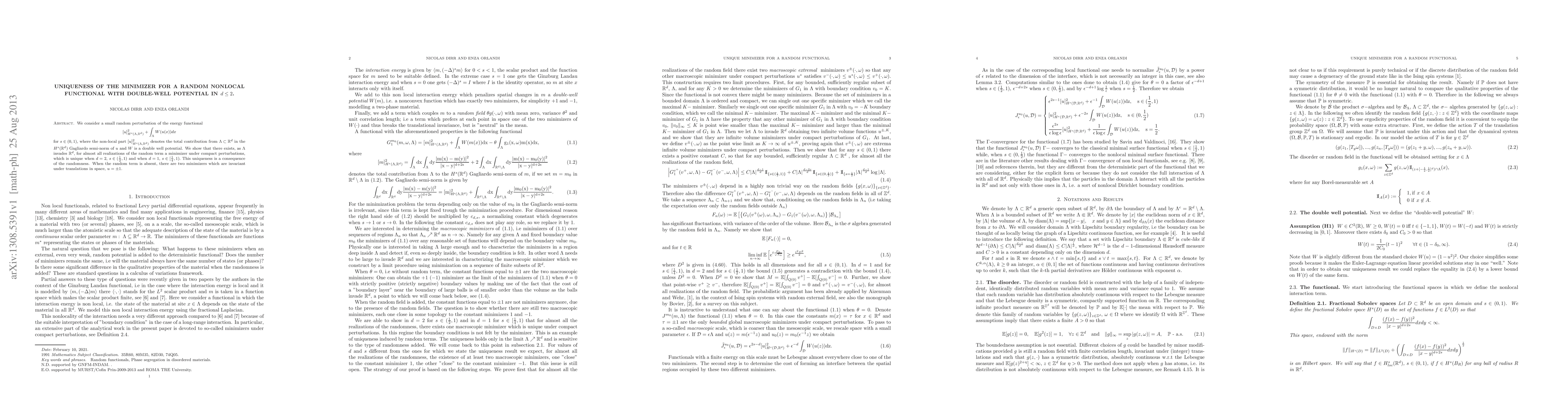 We consider a small random perturbation of the energy functional $$ [u]^2_{H^s(\Lambda, R^d)} + \int_\Lambda W(u(x)) dx $$ for $s \in (0,1),$ where the non-local part $ [u]^2_{H^s(\Lambda,R^d)}$ denotes the total contribution from $\Lambda \subset R^d$ in the $H^s (R^d)$ Gagliardo semi-norm of $u$ and $W$ is a double well potential. We show that there exists, as $\Lambda $ invades $ R^d$, for almost all realizations of the random term a minimizer under compact perturbations, which is unique when $d=2$, $s \in (\frac 12,1)$ and when $d=1$, $s \in [\frac 14, 1).$ This uniqueness is a consequence of the randomness. When the random term is absent, there are two minimizers which are invariant under translations in space, $u = \pm 1$.