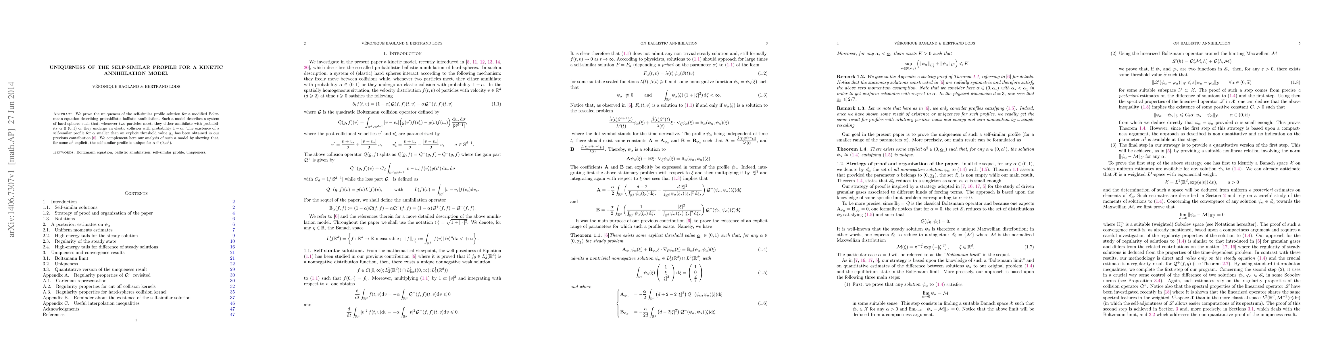 We show the existence of a self-similar solution for a We prove the uniqueness of the self-similar profile solution for a modified Boltzmann equation describing probabilistic ballistic annihilation. Such a model describes a system of hard spheres such that, whenever two particles meet, they either annihilate with probability $\alpha \in (0,1)$ or they undergo an elastic collision with probability $1-\alpha$. The existence of a self-similar profile for $\alpha$ smaller than an explicit threshold value $\underline{\alpha}_1$ has been obtained in our previous contribution (J. Differential Equations, 254, 3023--3080, 2013). . We complement here our analysis of such a model by showing that, for some $\alpha^{\sharp} $ explicit, the self-similar profile is unique for $\alpha \in (0,\alpha^{\sharp})$.