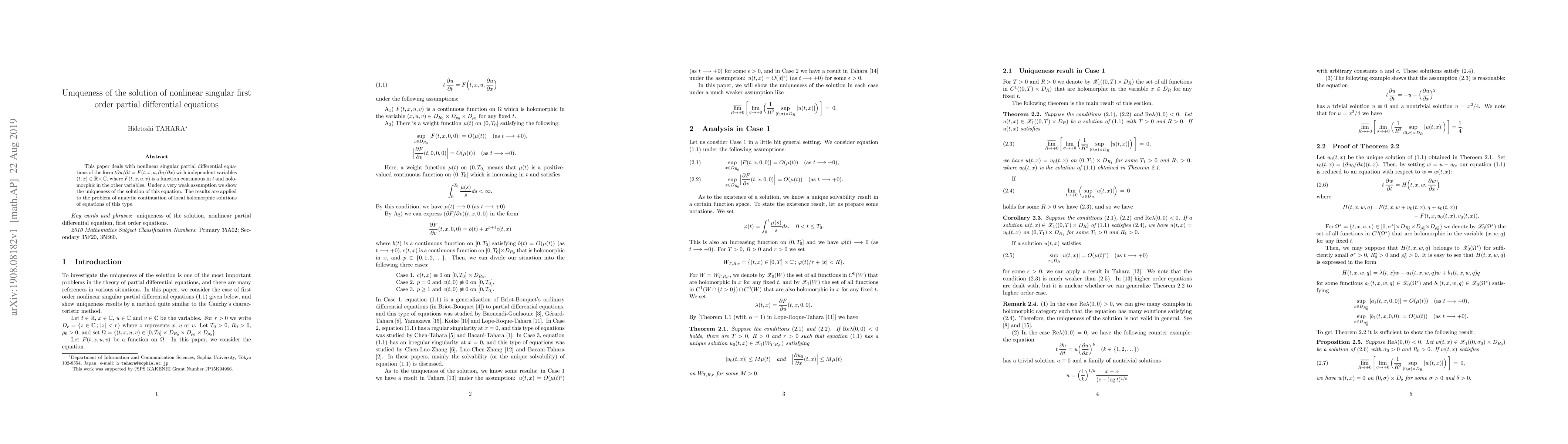 This paper establishes the uniqueness of solutions for nonlinear singular first-order partial differential equations under minimal assumptions. The results are applied to the analytic continuation of local holomorphic solutions.