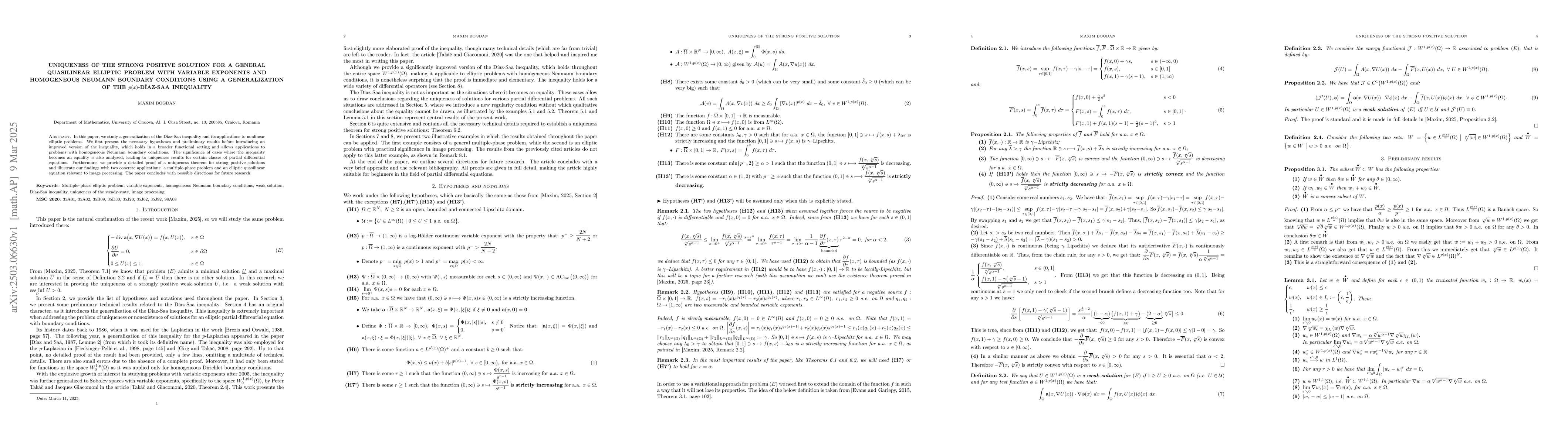 This paper generalizes the Díaz-Sáa inequality to a broader functional setting, applying it to quasilinear elliptic problems with variable exponents and Neumann boundary conditions. It proves the uniqueness of strong positive solutions for these problems, illustrated through applications in multiple-phase problems and image processing.