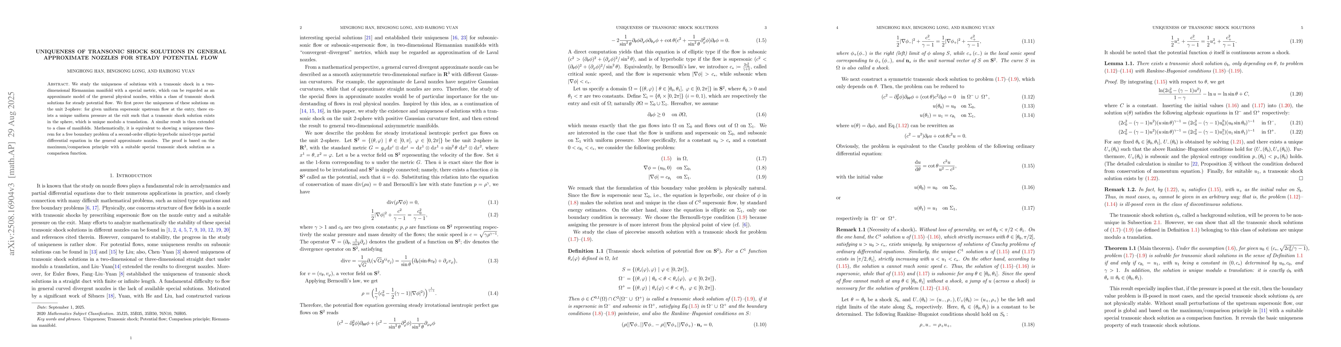 We study the uniqueness of solutions with a transonic shock in a two-dimensional Riemannian manifold with a special metric, which can be regarded as an approximate model of the general physical nozzles, within a class of transonic shock solutions for steady potential flow. We first prove the uniqueness of these solutions on the unit 2-sphere: for given uniform supersonic upstream flow at the entry, there exists a unique uniform pressure at the exit such that a transonic shock solution exists in the sphere, which is unique modulo a translation. A similar result is then extended to a class of manifolds. Mathematically, it is equivalent to showing a uniqueness theorem for a free boundary problem of a second-order elliptic-hyperbolic mixed-type partial differential equation in the general approximate nozzles. The proof is based on the maximum/comparison principle with a suitable special transonic shock solution as a comparison function.
