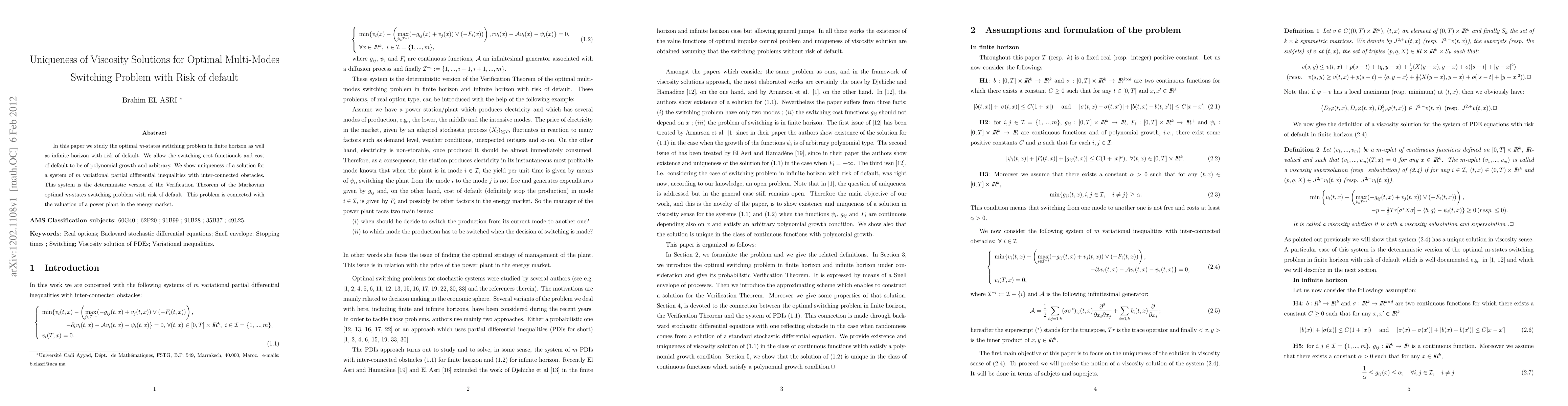 Researchers show that a system of partial differential inequalities has a unique solution for optimal multi-mode switching with risk of default, solving a key problem in finance and energy markets.