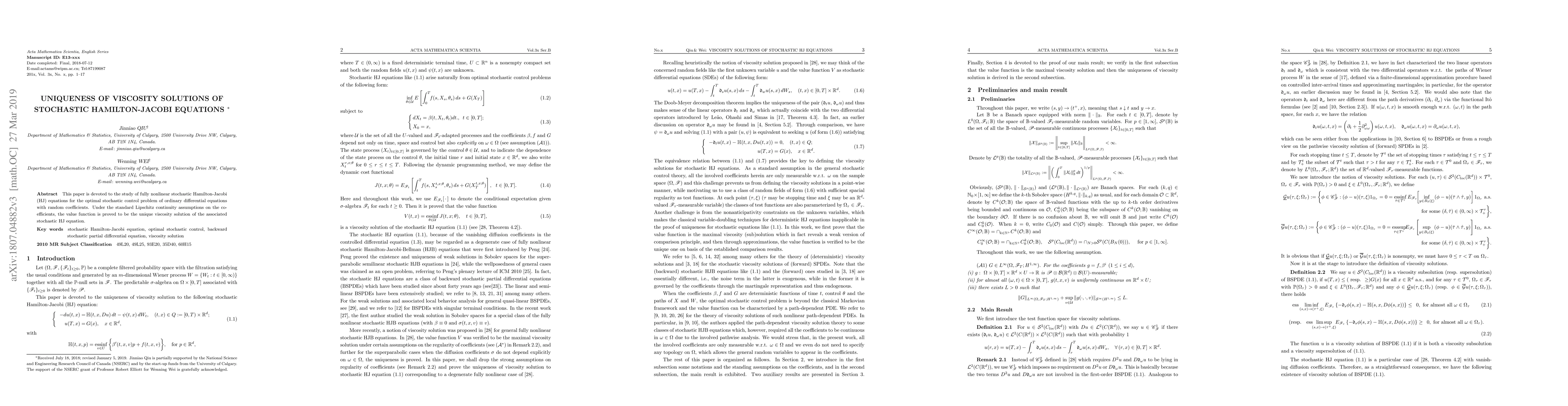 This paper establishes the uniqueness of viscosity solutions for fully nonlinear stochastic Hamilton-Jacobi equations arising in optimal stochastic control problems. Under standard Lipschitz continuity assumptions, the value function is shown to be the unique viscosity solution.