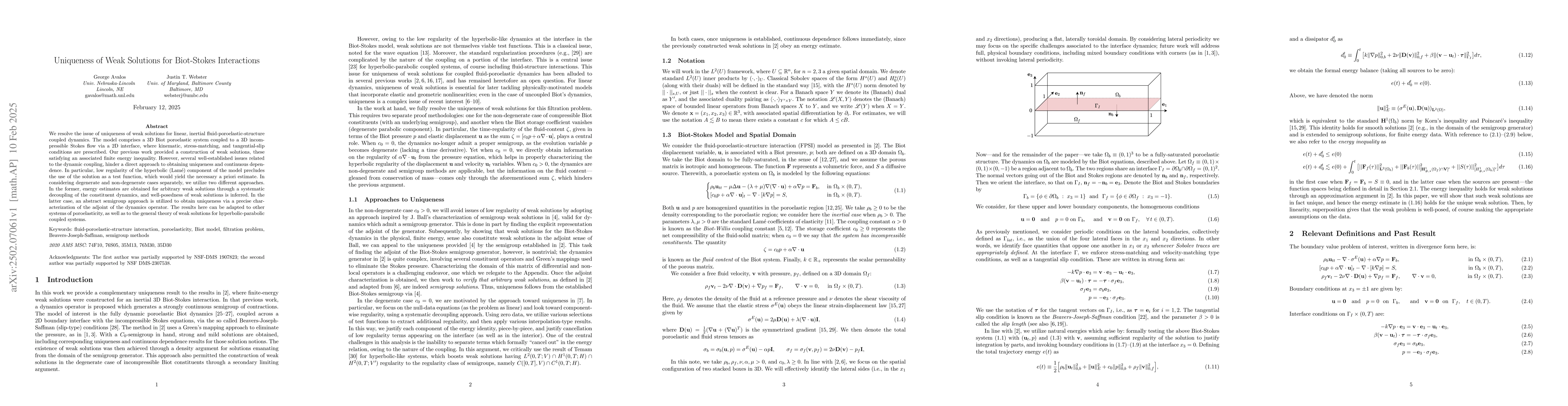 The paper employs a semigroup approach and energy estimates to resolve the uniqueness of weak solutions for Biot-Stokes interactions, distinguishing between degenerate and non-degenerate cases.