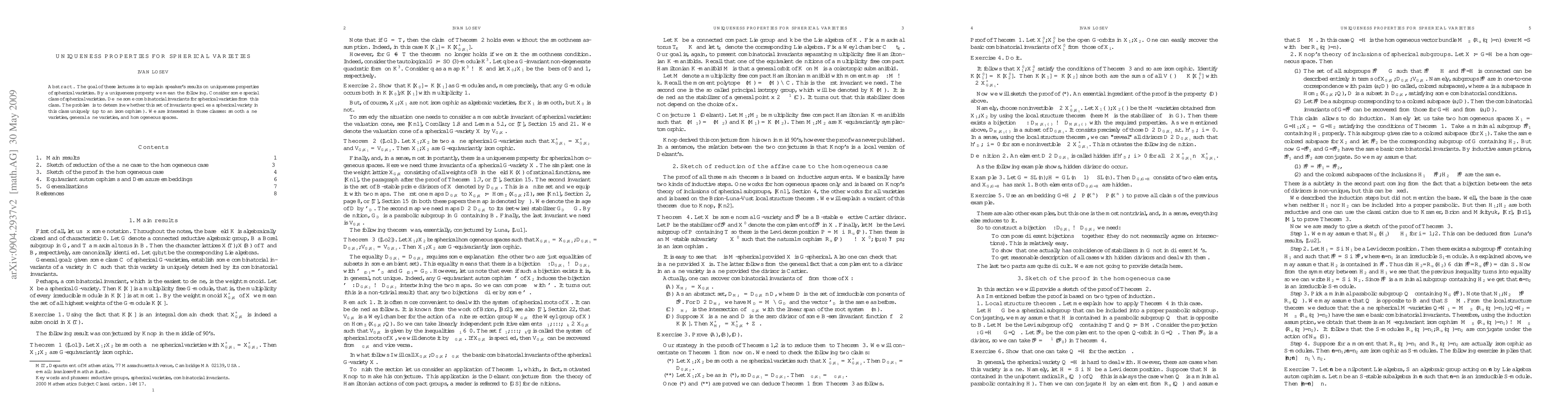 Summary: This paper explores uniqueness properties of spherical varieties within three classes: smooth affine, general affine varieties, and homogeneous spaces, focusing on whether combinatorial invariants uniquely specify each variety up to isomorphism.