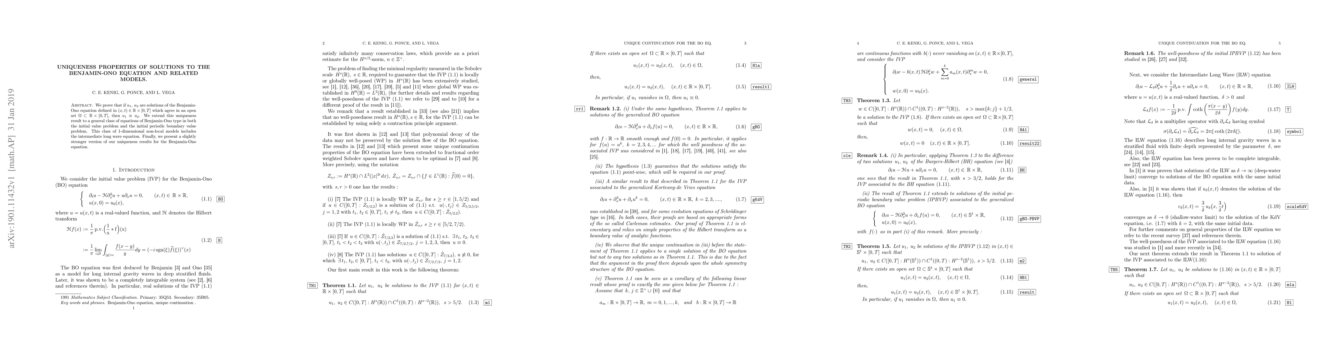 This paper proves the uniqueness of solutions to the Benjamin-Ono equation and related models, showing that if two solutions agree in an open set, they must be identical. The results are extended to a broader class of Benjamin-Ono type equations, including the intermediate long wave equation, and a stronger version of uniqueness is presented for the Benjamin-Ono equation itself.