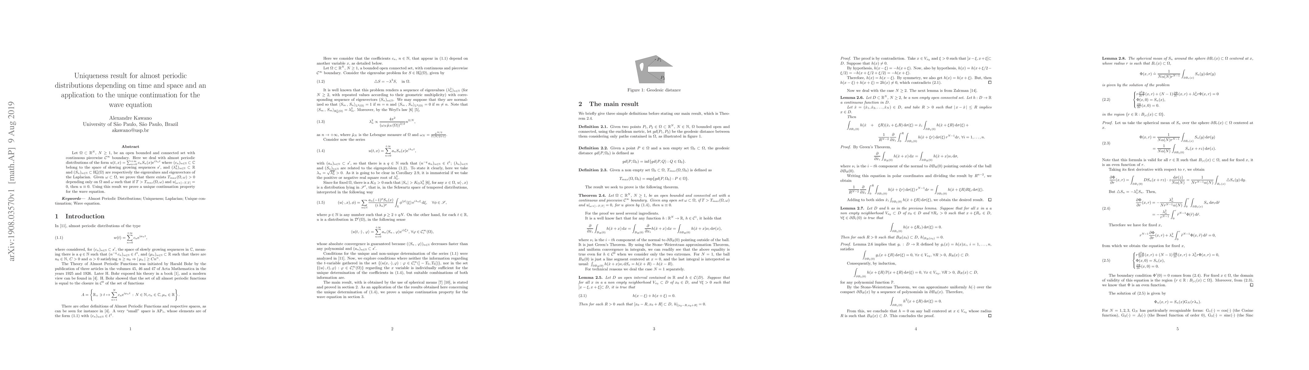 Let $\Omega\subset \mathbb{R}^N$, $N=1,2,3$, be an open bounded and connected set with continuous piecewise $\mathrm{C}^{\infty}$ boundary. Here we deal with almost periodic distributions of the form $u(t,x)=\sum_{n=0}^{+\infty} c_n S_n(x) \mathrm{e}^{i \lambda_n t}$ where $(c_n)_{n\in \mathbb{N}}\subset \mathbb{C}$ belong to the space of slowing growing sequences $s^\prime$, and $(\lambda_n^2)_{n\in\mathbb{N}}\subset \mathbb{R}$ and $(S_n)_{n\in\mathbb{N}}\subset \mathrm{H}_0^{1}(\Omega)$ are respectively the eigenvalues and eigenvectors of the Laplacian. Given $\omega\subset\Omega$, we prove that there exists $T_{max}(\Omega,\omega)>0$ depending only on $\Omega$ and $\omega$ such that if $T>T_{max}(\Omega,\omega)$ and $u|_{\omega\times ]-T,T[}=0$, then $u\equiv 0$. Using this result we prove a unique continuation property for the wave equation.