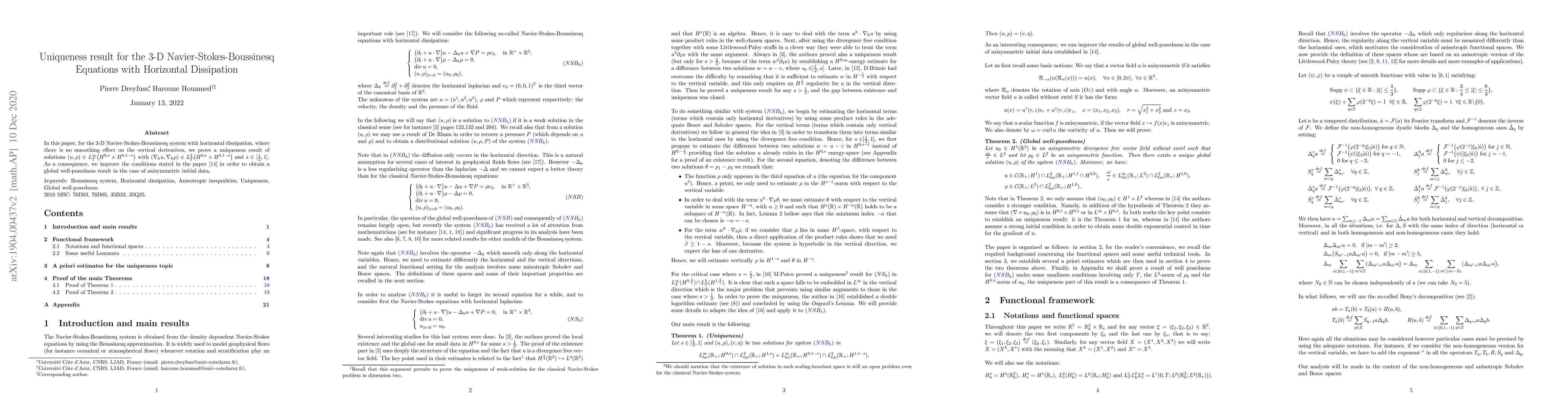In this paper, for the 3-D Navier-Stokes-Boussinesq system with horizontal dissipation, where there is no smoothing effect on the vertical derivatives, we prove a uniqueness result of solutions $ (u,\rho)\in L^{\infty}_T\big( H^{0,s}\times H^{0,1-s}\big)$ with $ (\nabla_h u,\nabla_h\rho)\in L^{2}_T\big( H^{0,s}\times H^{0,1-s}\big)$ and $s\in [1/2,1]$. As a consequence, we improve the conditions stated in the paper \cite{Miao} in order to obtain a global well-posedness result in the case of axisymmetric initial data.