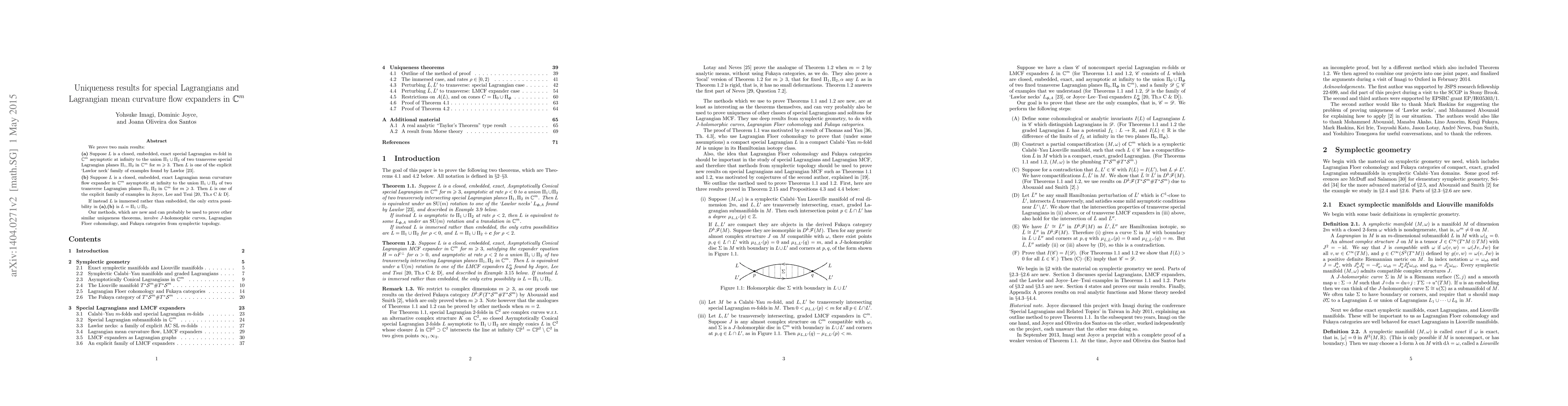 Researchers prove uniqueness results for special Lagrangians and mean curvature flow expanders in complex spaces, showing that certain configurations can only occur under specific conditions.