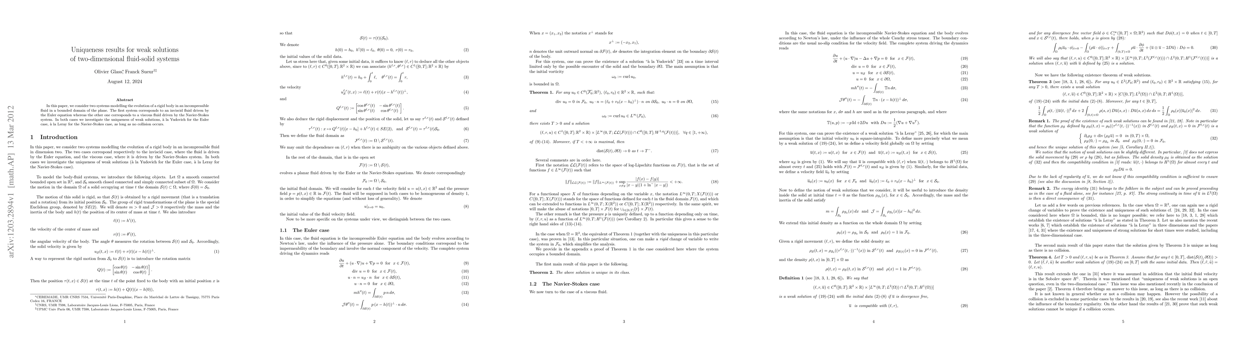 In this paper, we consider two systems modelling the evolution of a rigid body in an incompressible fluid in a bounded domain of the plane. The first system corresponds to an inviscid fluid driven by the Euler equation whereas the other one corresponds to a viscous fluid driven by the Navier-Stokes system. In both cases we investigate the uniqueness of weak solutions, "\`a la Yudovich" for the Euler case, "\`a la Leray" for the Navier-Stokes case, as long as no collision occurs.