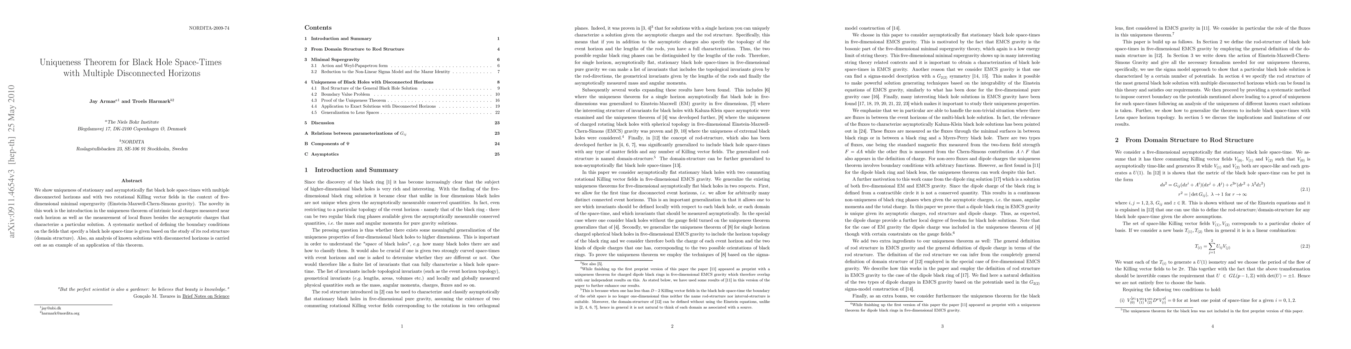 This paper proves the uniqueness of stationary, asymptotically flat black hole space-times with multiple disconnected horizons in five-dimensional minimal supergravity, incorporating intrinsic local charges and local fluxes. The study introduces a systematic method for defining boundary conditions based on the rod structure and analyzes known solutions as an example.