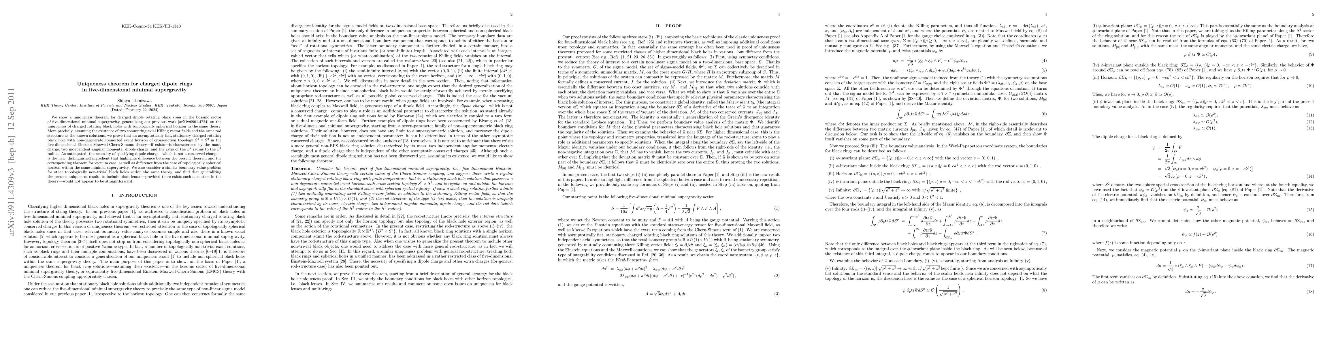 This paper proves a uniqueness theorem for charged dipole rotating black rings in five-dimensional minimal supergravity, extending previous results for charged rotating black holes. It highlights the necessity of specifying the dipole charge, which distinguishes this theorem from others in the same theory.
