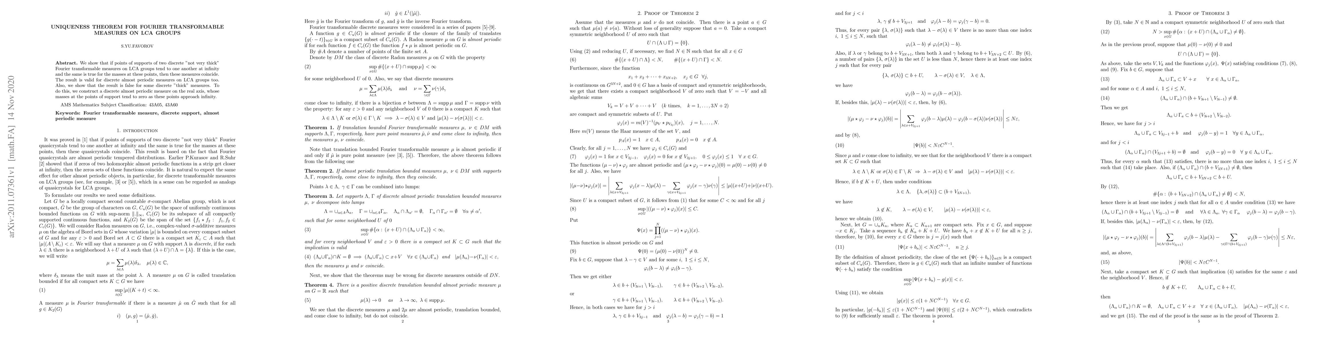 We show that if points of supports of two discrete "not very thick" Fourier transformable measures on LCA groups tend to one another at infinity and the same is true for the masses at these points, then these measures coincide. The result is valid for discrete almost periodic measures on LCA groups too. Also, we show that the result is false for some discrete "thick" measures. To do this, we construct a discrete almost periodic measure on the real axis, whose masses at the points of support tend to zero as these points approach infinity.