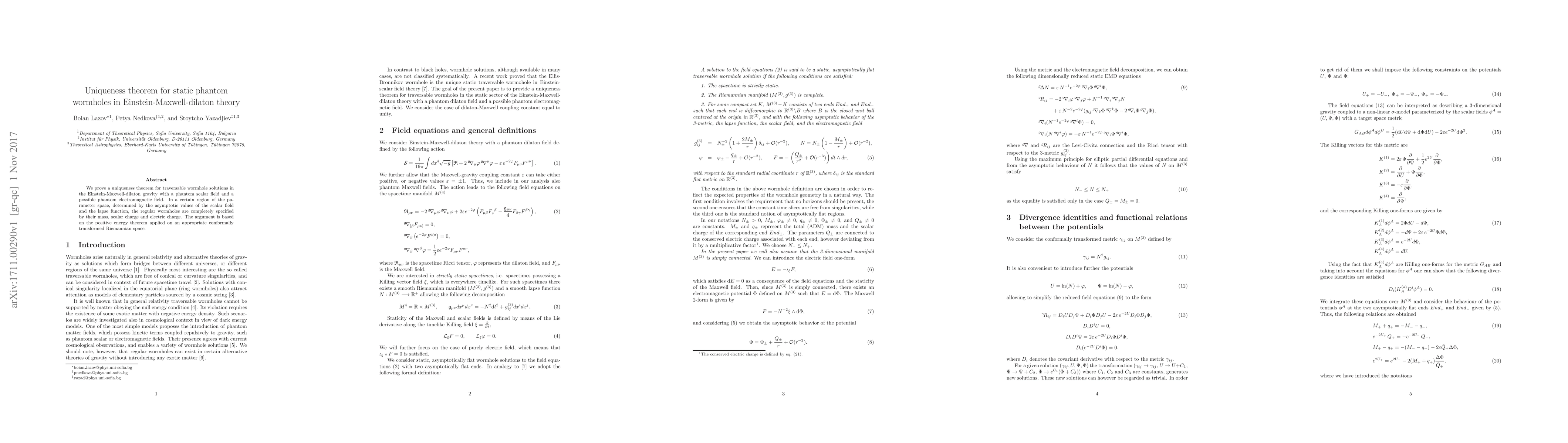This paper proves a uniqueness theorem for traversable phantom wormholes in Einstein-Maxwell-dilaton theory, showing that regular wormholes are fully determined by their mass, scalar charge, and electric charge within a specific parameter region. The proof leverages the positive energy theorem applied to a conformally transformed Riemannian space.