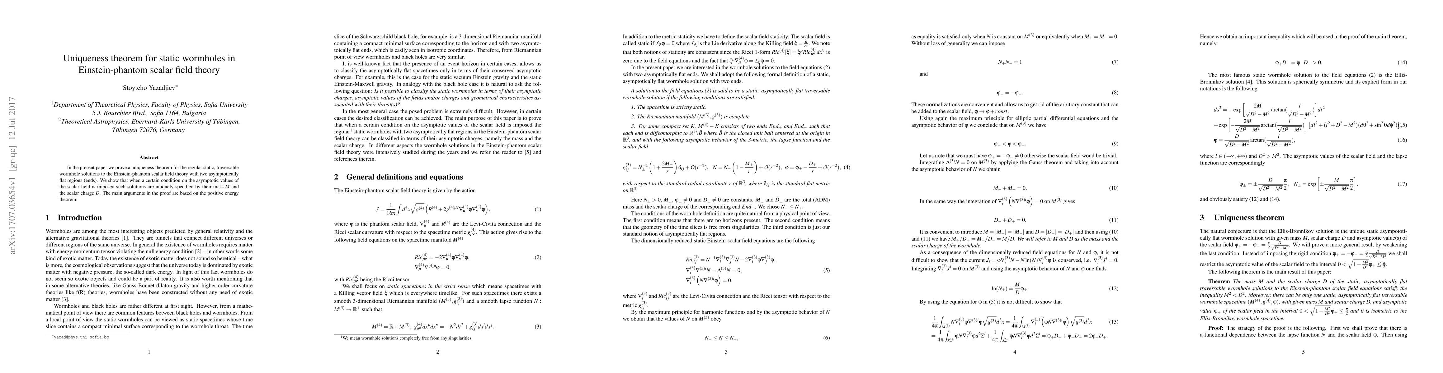 This paper proves a uniqueness theorem for static, traversable wormholes in Einstein-phantom scalar field theory, showing that under specific conditions, such solutions are uniquely determined by their mass $M$ and scalar charge $D$. The proof leverages the positive energy theorem.