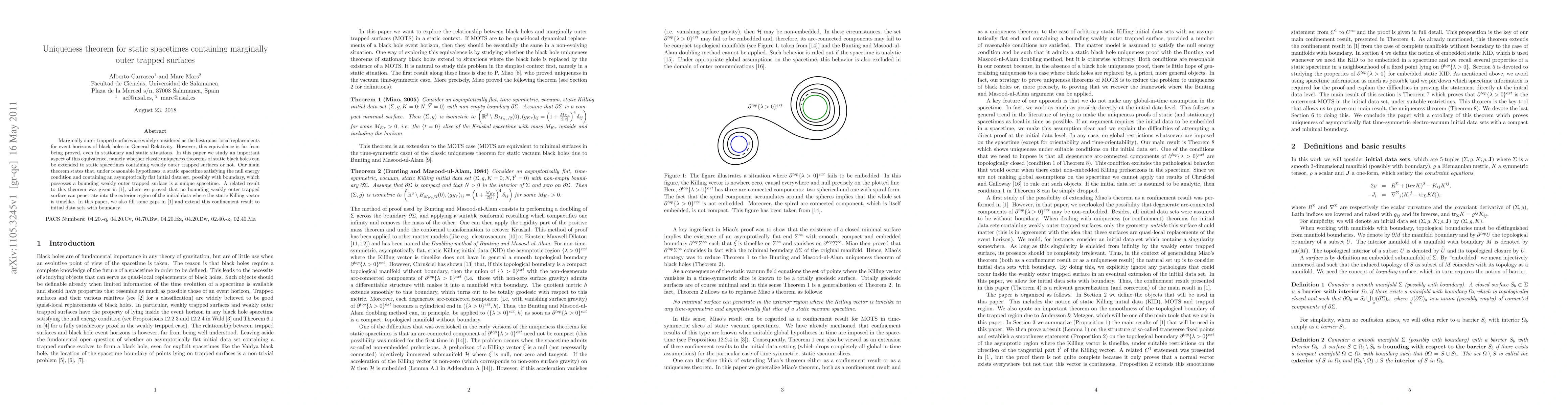 Marginally outer trapped surfaces are widely considered as the best quasi-local replacements for event horizons of black holes in General Relativity. However, this equivalence is far from being proved, even in stationary and static situations. In this paper we study an important aspect of this equivalence, namely whether classic uniqueness theorems of static black holes can be extended to static spacetimes containing weakly outer trapped surfaces or not. Our main theorem states that, under reasonable hypotheses, a static spacetime satisfying the null energy condition and containing an asymptotically flat initial data set, possibly with boundary, which possesses a bounding weakly outer trapped surface is a unique spacetime. A related result to this theorem was given in arXiv:0711.1299, where we proved that no bounding weakly outer trapped surface can penetrate into the exterior region of the initial data where the static Killing vector is timelike. In this paper, we also fill some gaps in arXiv:0711.1299 and extend this confinement result to initial data sets with boundary.