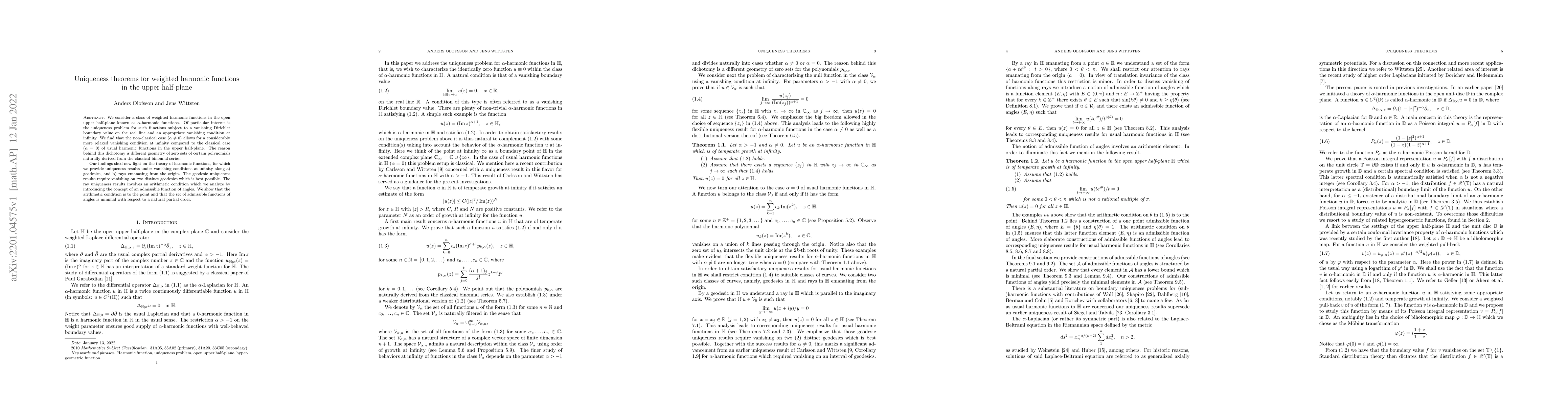 We consider a class of weighted harmonic functions in the open upper half-plane known as $\alpha$-harmonic functions. Of particular interest is the uniqueness problem for such functions subject to a vanishing Dirichlet boundary value on the real line and an appropriate vanishing condition at infinity. We find that the non-classical case ($\alpha\neq0$) allows for a considerably more relaxed vanishing condition at infinity compared to the classical case ($\alpha=0$) of usual harmonic functions in the upper half-plane. The reason behind this dichotomy is different geometry of zero sets of certain polynomials naturally derived from the classical binomial series. Our findings shed new light on the theory of harmonic functions, for which we provide uniqueness results under vanishing conditions at infinity along a) geodesics, and b) rays emanating from the origin. The geodesic uniqueness results require vanishing on two distinct geodesics which is best possible. The ray uniqueness results involves an arithmetic condition which we analyze by introducing the concept of an admissible function of angles. We show that the arithmetic condition is to the point and that the set of admissible functions of angles is minimal with respect to a natural partial order.
