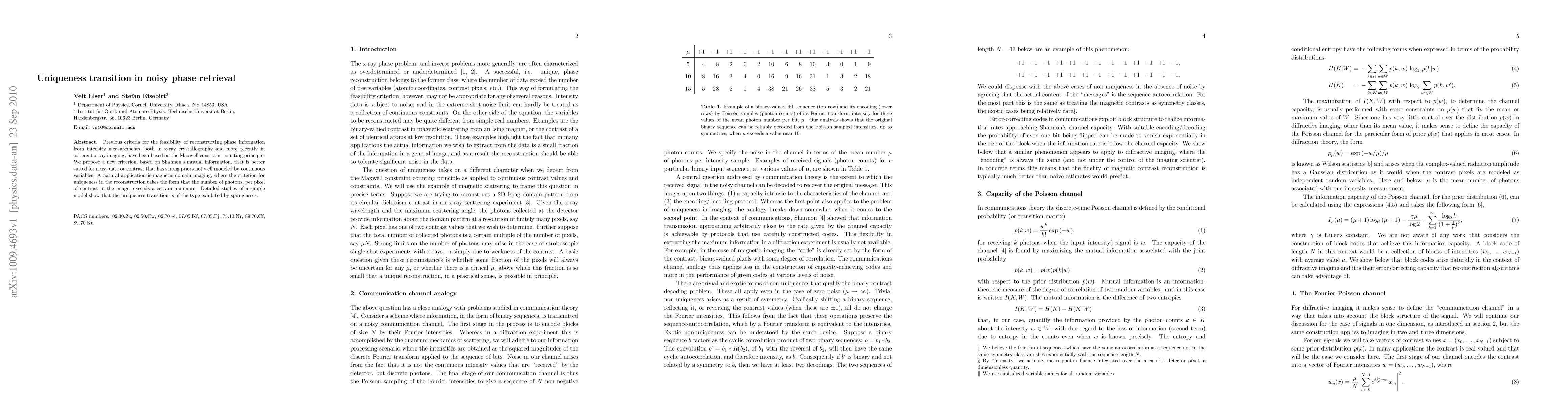 Previous criteria for the feasibility of reconstructing phase information from intensity measurements, both in x-ray crystallography and more recently in coherent x-ray imaging, have been based on the Maxwell constraint counting principle. We propose a new criterion, based on Shannon's mutual information, that is better suited for noisy data or contrast that has strong priors not well modeled by continuous variables. A natural application is magnetic domain imaging, where the criterion for uniqueness in the reconstruction takes the form that the number of photons, per pixel of contrast in the image, exceeds a certain minimum. Detailed studies of a simple model show that the uniqueness transition is of the type exhibited by spin glasses.