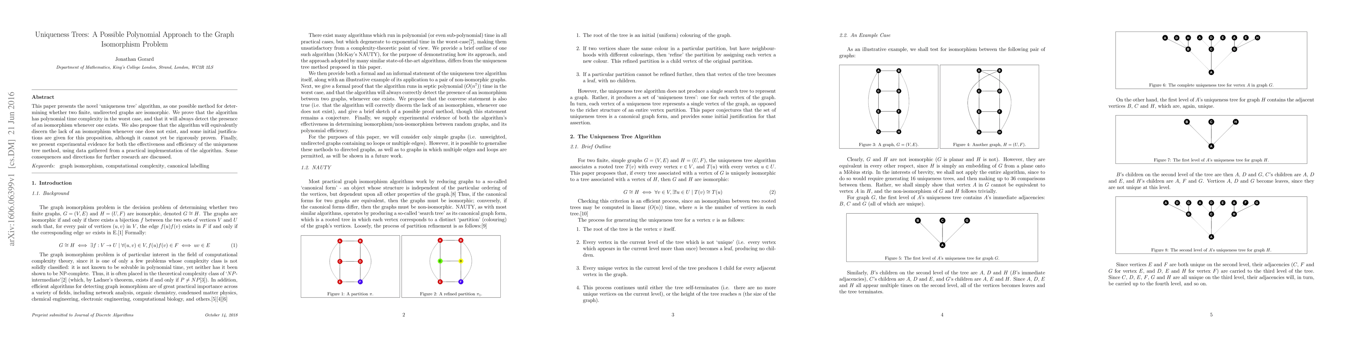 This paper presents the novel `uniqueness tree' algorithm, as one possible method for determining whether two finite, undirected graphs are isomorphic. We prove that the algorithm has polynomial time complexity in the worst case, and that it will always detect the presence of an isomorphism whenever one exists. We also propose that the algorithm will equivalently discern the lack of an isomorphism whenever one does not exist, and some initial justifications are given for this proposition, although it cannot yet be rigorously proven. Finally, we present experimental evidence for both the effectiveness and efficiency of the uniqueness tree method, using data gathered from a practical implementation of the algorithm. Some consequences and directions for further research are discussed.
