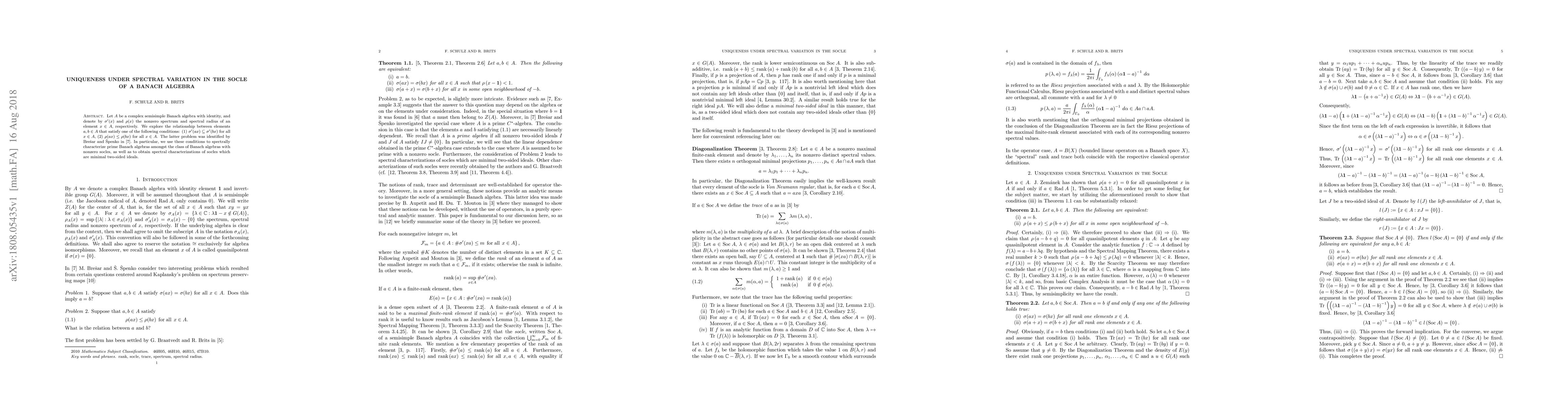 Let $A$ be a complex semisimple Banach algebra with identity, and denote by $\sigma'(x)$ and $\rho (x)$ the nonzero spectrum and spectral radius of an element $x \in A$, respectively. We explore the relationship between elements $a, b \in A$ that satisfy one of the following conditions: (1) $\sigma' (ax) \subseteq \sigma' (bx)$ for all $x \in A$, (2) $\rho (ax) \leq \rho (bx)$ for all $x \in A$. The latter problem was identified by Bre\v{s}ar and \v{S}penko in [7]. In particular, we use these conditions to spectrally characterize prime Banach algebras amongst the class of Banach algebras with nonzero socles, as well as to obtain spectral characterizations of socles which are minimal two-sided ideals.