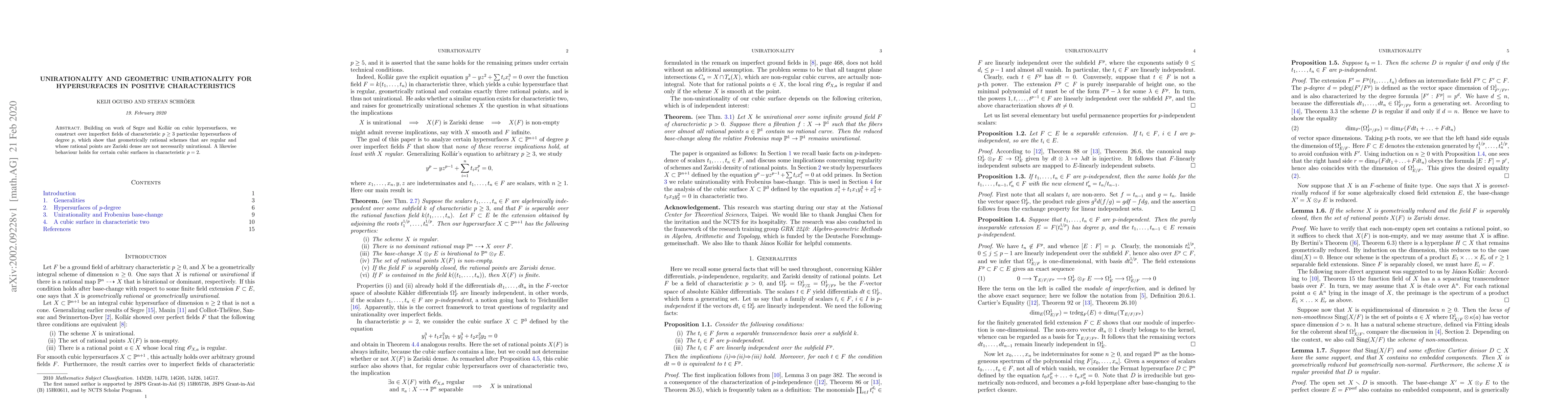 This paper constructs specific hypersurfaces of degree p in positive characteristic fields, demonstrating that geometrically rational, regular schemes with dense rational points are not necessarily unirational. It also shows similar behavior for certain cubic surfaces in characteristic p=2.