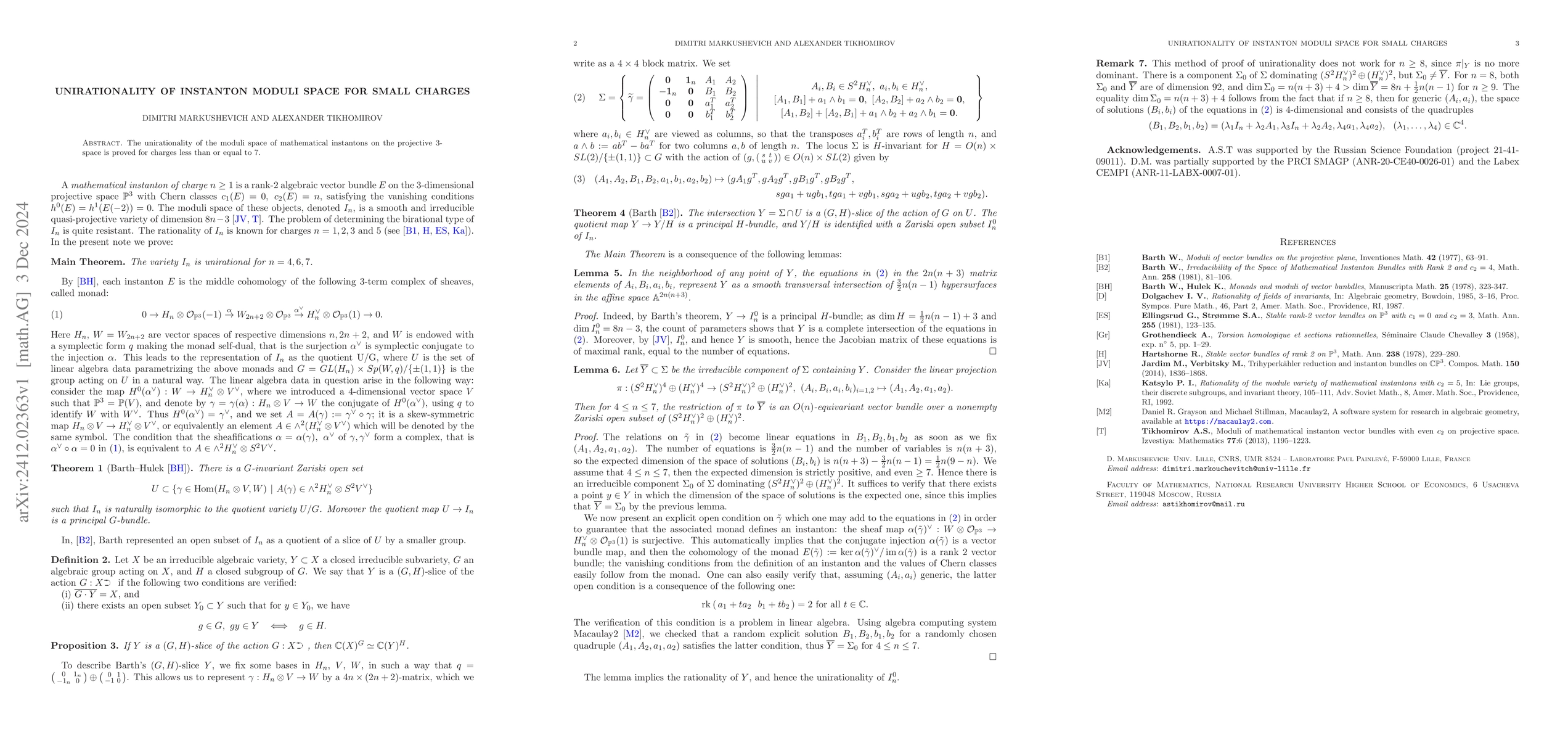 The paper proves the unirationality of the moduli space for instantons on projective 3-space for charges up to 7, establishing that such spaces can be rationally parametrized. This result extends understanding of the geometric properties of instanton moduli spaces.