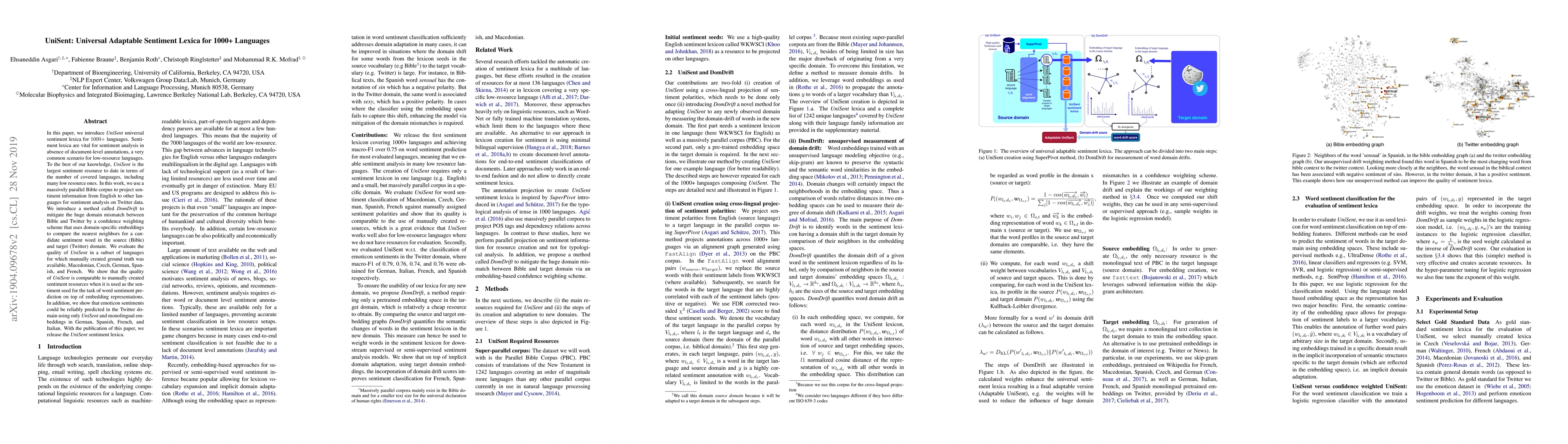 This paper introduces UniSent, a universal sentiment lexicon for over 1000 languages, developed using a parallel Bible corpus to project English sentiment information. The DomDrift method mitigates domain mismatch, and evaluations show comparable quality to manually created resources for sentiment analysis.