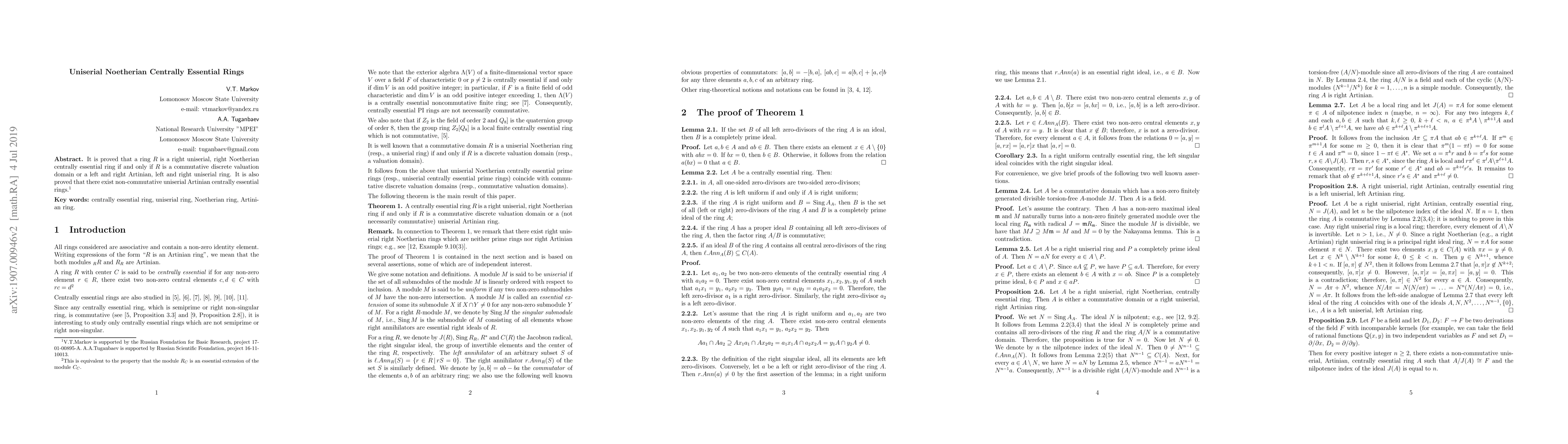 This paper proves that a right uniserial, right Noetherian centrally essential ring $R$ is either a commutative discrete valuation domain or a left and right Artinian, uniserial ring. Additionally, it demonstrates the existence of non-commutative uniserial Artinian centrally essential rings. Funding acknowledgments are given for the authors' research support.