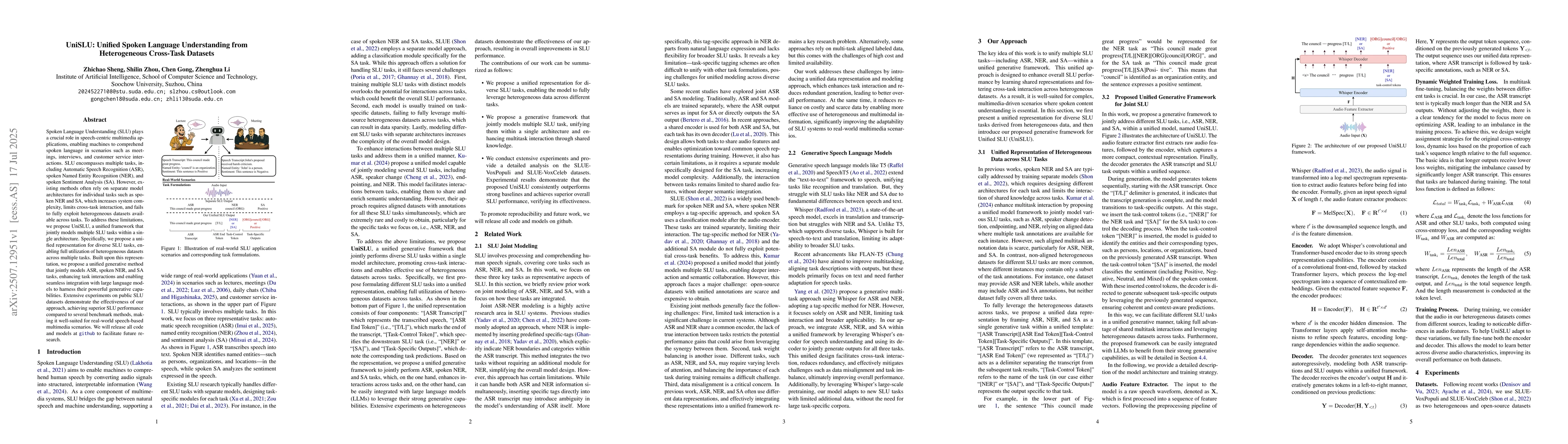 Spoken Language Understanding (SLU) plays a crucial role in speech-centric multimedia applications, enabling machines to comprehend spoken language in scenarios such as meetings, interviews, and customer service interactions. SLU encompasses multiple tasks, including Automatic Speech Recognition (ASR), spoken Named Entity Recognition (NER), and spoken Sentiment Analysis (SA). However, existing methods often rely on separate model architectures for individual tasks such as spoken NER and SA, which increases system complexity, limits cross-task interaction, and fails to fully exploit heterogeneous datasets available across tasks. To address these limitations, we propose UniSLU, a unified framework that jointly models multiple SLU tasks within a single architecture. Specifically, we propose a unified representation for diverse SLU tasks, enabling full utilization of heterogeneous datasets across multiple tasks. Built upon this representation, we propose a unified generative method that jointly models ASR, spoken NER, and SA tasks, enhancing task interactions and enabling seamless integration with large language models to harness their powerful generative capabilities. Extensive experiments on public SLU datasets demonstrate the effectiveness of our approach, achieving superior SLU performance compared to several benchmark methods, making it well-suited for real-world speech-based multimedia scenarios. We will release all code and models at github to facilitate future research.