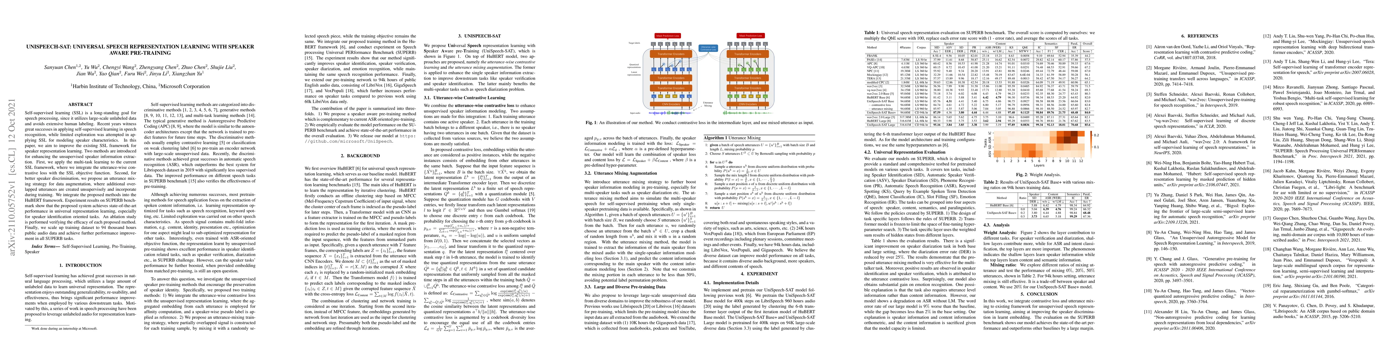 This paper introduces UniSpeech-SAT, a framework for universal speech representation learning that enhances speaker information extraction through multi-task learning and an unsupervised utterance mixing strategy. Experiments demonstrate state-of-the-art performance on the SUPERB benchmark, especially for speaker identification tasks, with further improvements achieved by scaling up the training dataset.