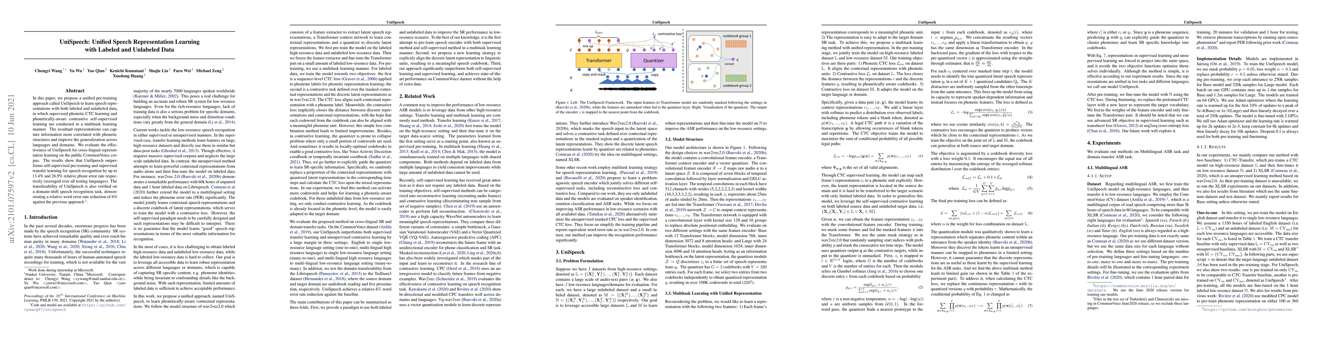 UniSpeech is a unified pre-training method that leverages both labeled and unlabeled data to learn speech representations, combining supervised and self-supervised learning. It outperforms traditional methods in cross-lingual and domain-shift speech recognition tasks, achieving significant reductions in error rates.