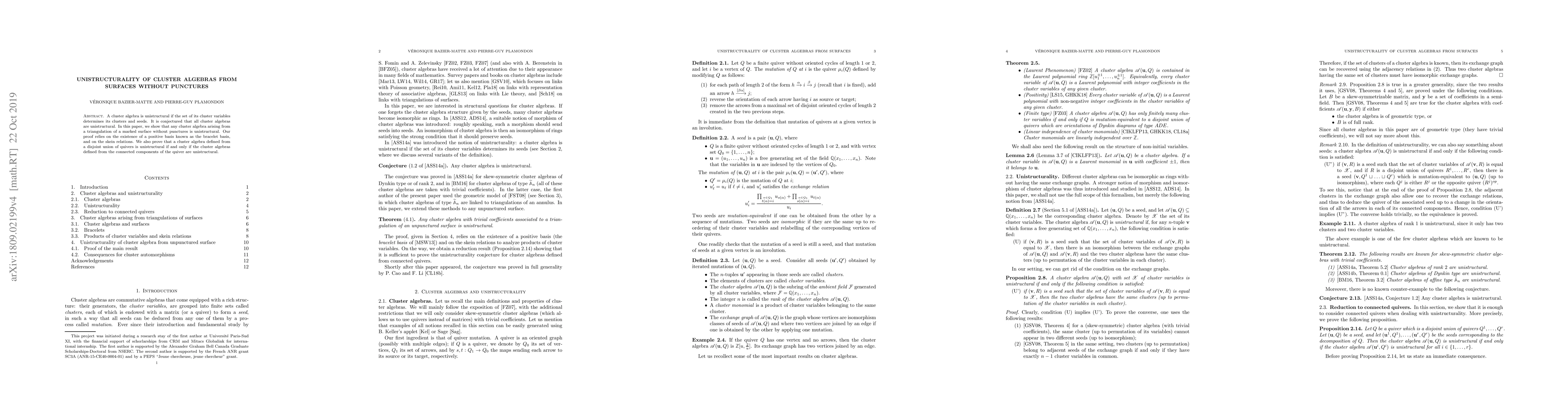 Cluster algebras from surfaces without punctures are shown to be unistructural, meaning their cluster variables uniquely determine clusters and seeds, in a proof that aligns with the conjecture that all cluster algebras are unistructural.