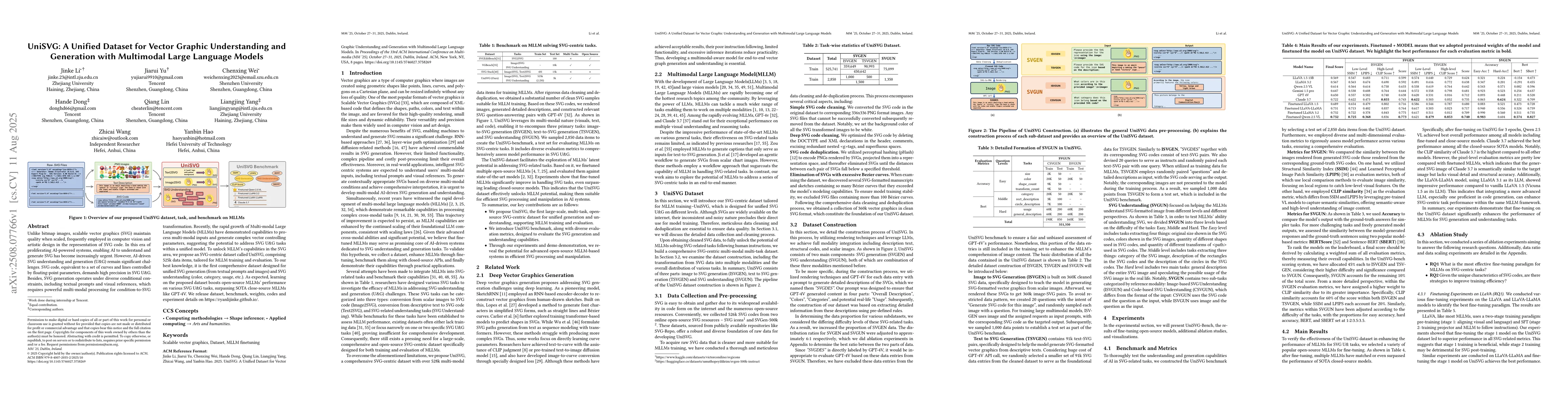 The paper introduces UniSVG, a unified dataset for training and evaluating multimodal large language models (MLLMs) on vector graphic understanding and generation tasks. UniSVG, comprising 525k data items, supports tasks like generating SVGs from textual prompts or images and understanding SVG attributes. The dataset significantly enhances the performance of open-source MLLMs on various SVG understanding and generation tasks, outperforming closed-source MLLMs like GPT-4V.