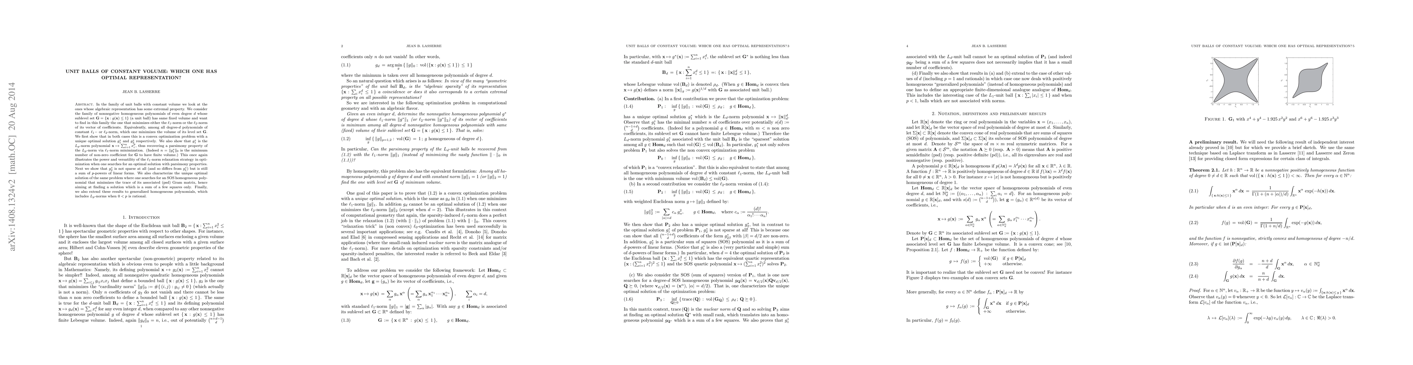 This paper investigates unit balls with constant volume, focusing on the algebraic representation that minimizes either the $\ell_1$-norm or $\ell_2$-norm of its coefficients. It finds that the optimal $\ell_1$-norm solution is the $L_p$-norm polynomial, demonstrating parsimony, while the $\ell_2$-norm solution is non-sparse but still a sum of $p$-powers of linear forms.
