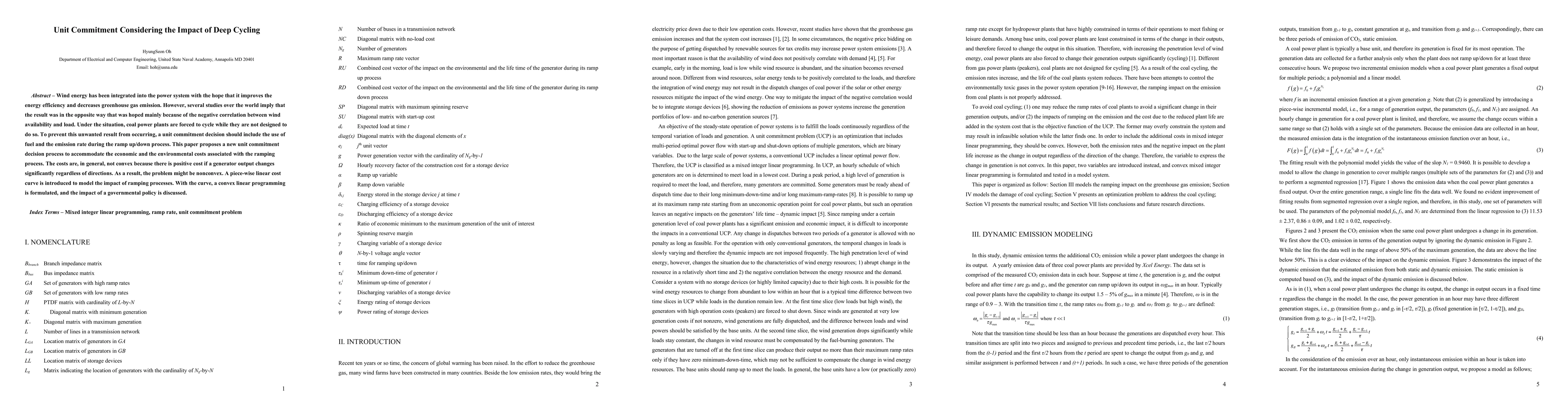 Wind energy has been integrated into the power system with the hope that it improves the energy efficiency and decreases greenhouse gas emission. However, several studies over the world imply that the result was in the opposite way that was hoped mainly because of the negative correlation between wind availability and load. Under the situation, coal power plants are forced to cycle while they are not designed to do so. To prevent this unwanted result from occurring, a unit commitment decision should include the use of fuel and the emission rate during the ramp up/down process. This paper proposes a new unit commitment decision process to accommodate the economic and the environmental costs associated with the ramping process. The costs are, in general, not convex because there is positive cost if a generator output changes significantly regardless of directions. As a result, the problem might be nonconvex. A piece-wise linear cost curve is introduced to model the impact of ramping processes. With the curve, a convex linear programming is formulated, and the impact of a governmental policy is discussed.