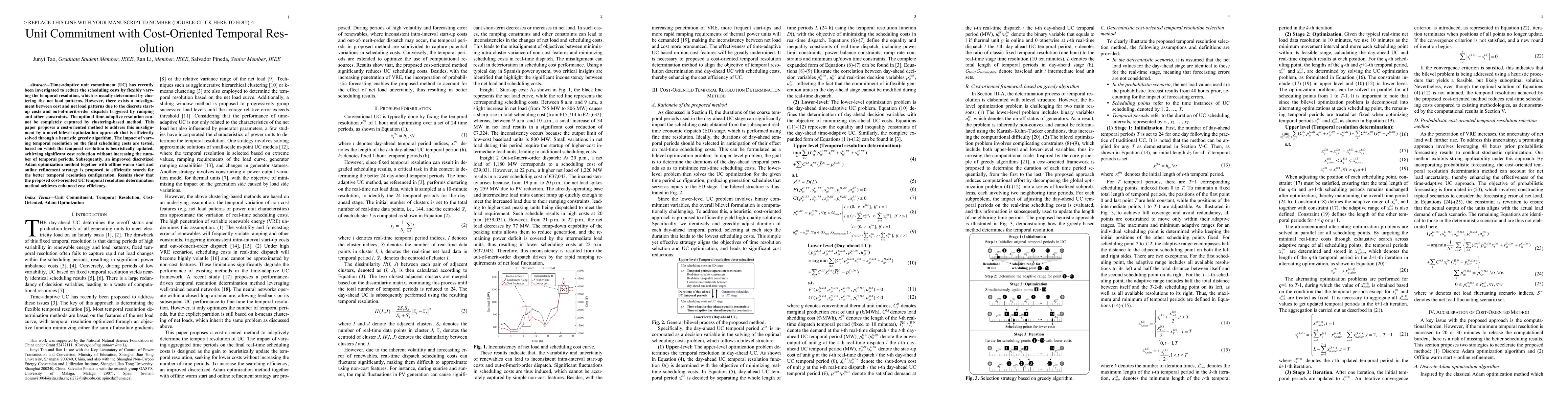 The paper proposes a cost-oriented method for unit commitment (UC) temporal resolution determination using a bilevel optimization approach, efficiently solved via a heuristic greedy algorithm. It further employs an improved discretized Adam optimization method with offline warm start and online refinement strategy.