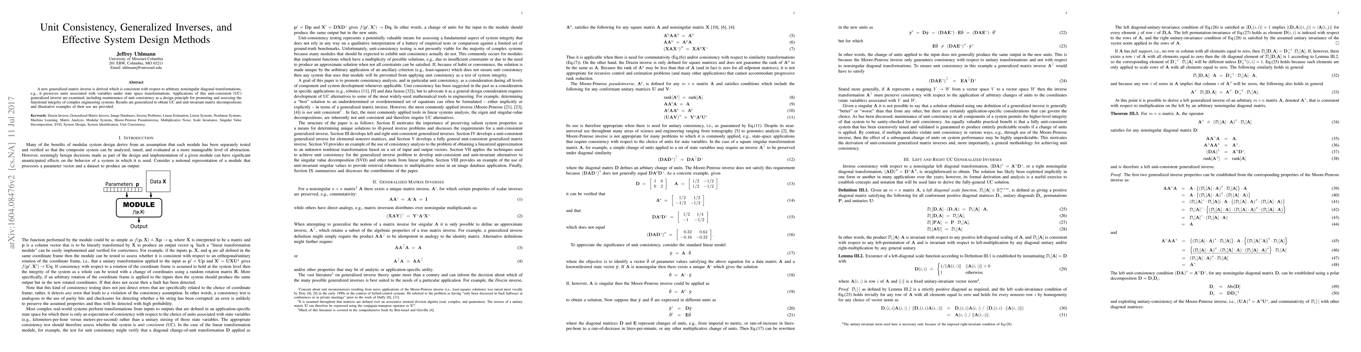 This paper examines the potential role of unit consistency as a system design principle. Unit-consistent generalized matrix inverses and unit-invariant matrix decompositions are derived in support of this principle. Applications of the methods described are illustrated with examples relating to nonlinear system identification and robustness to multiplicative noise for image database retrieval.
