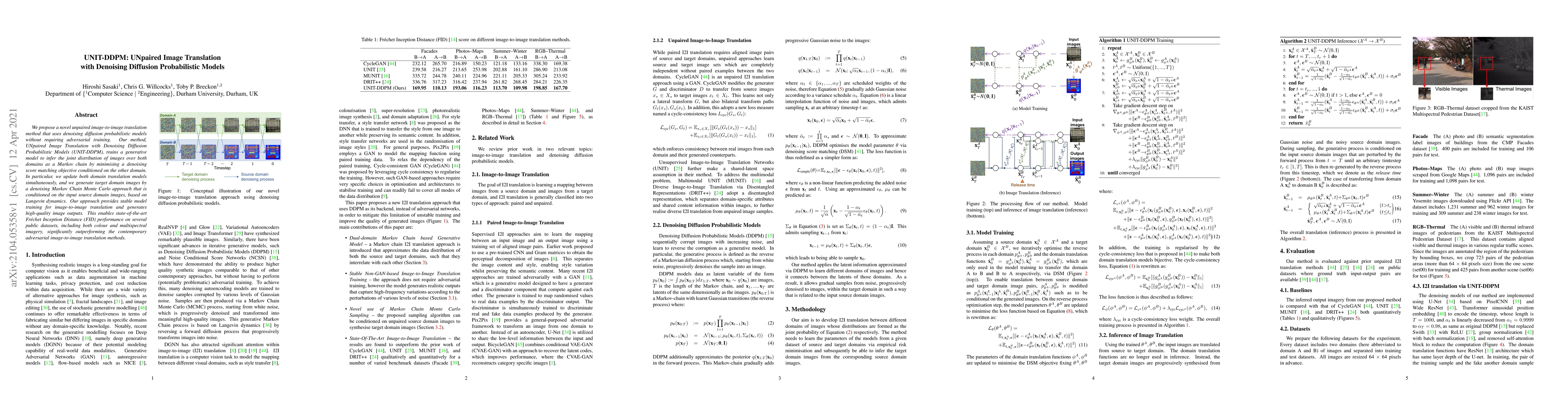 The paper introduces UNIT-DDPM, an unpaired image translation method using denoising diffusion probabilistic models that avoids adversarial training. It achieves stable training and high-quality image outputs through a joint distribution inference and a denoising Markov Chain Monte Carlo approach, outperforming adversarial methods in FID scores on various datasets.