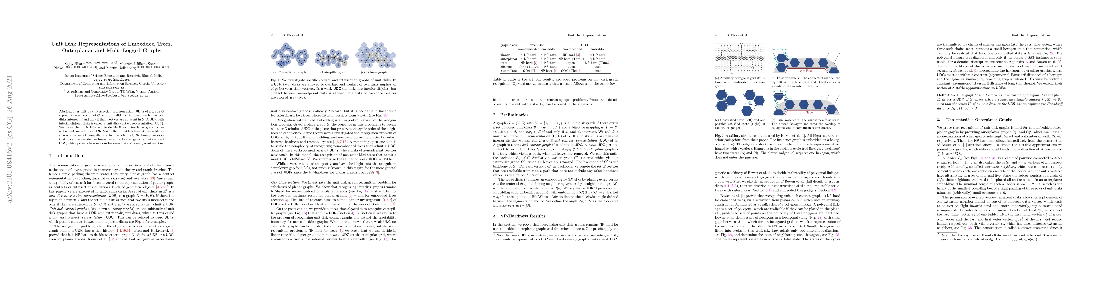 This paper investigates unit disk representations (UDR) of various graph types, proving that determining UDR for outerplanar graphs and embedded trees is NP-hard. It also provides a linear-time characterization for caterpillar graphs with UDR and a linear-time solution for deciding weak UDC in lobster graphs.