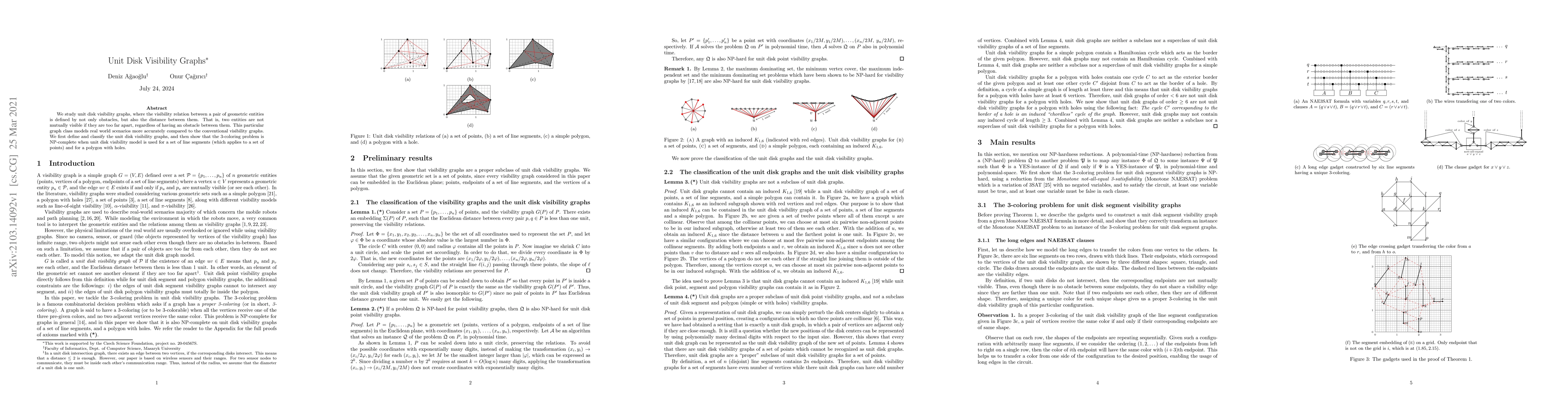 Unit disk visibility graphs consider distance in addition to obstacles for defining visibility between entities, offering a more accurate model of real-world scenarios. The study reveals that the 3-coloring problem is NP-complete for this graph class when applied to line segments and polygons with holes.